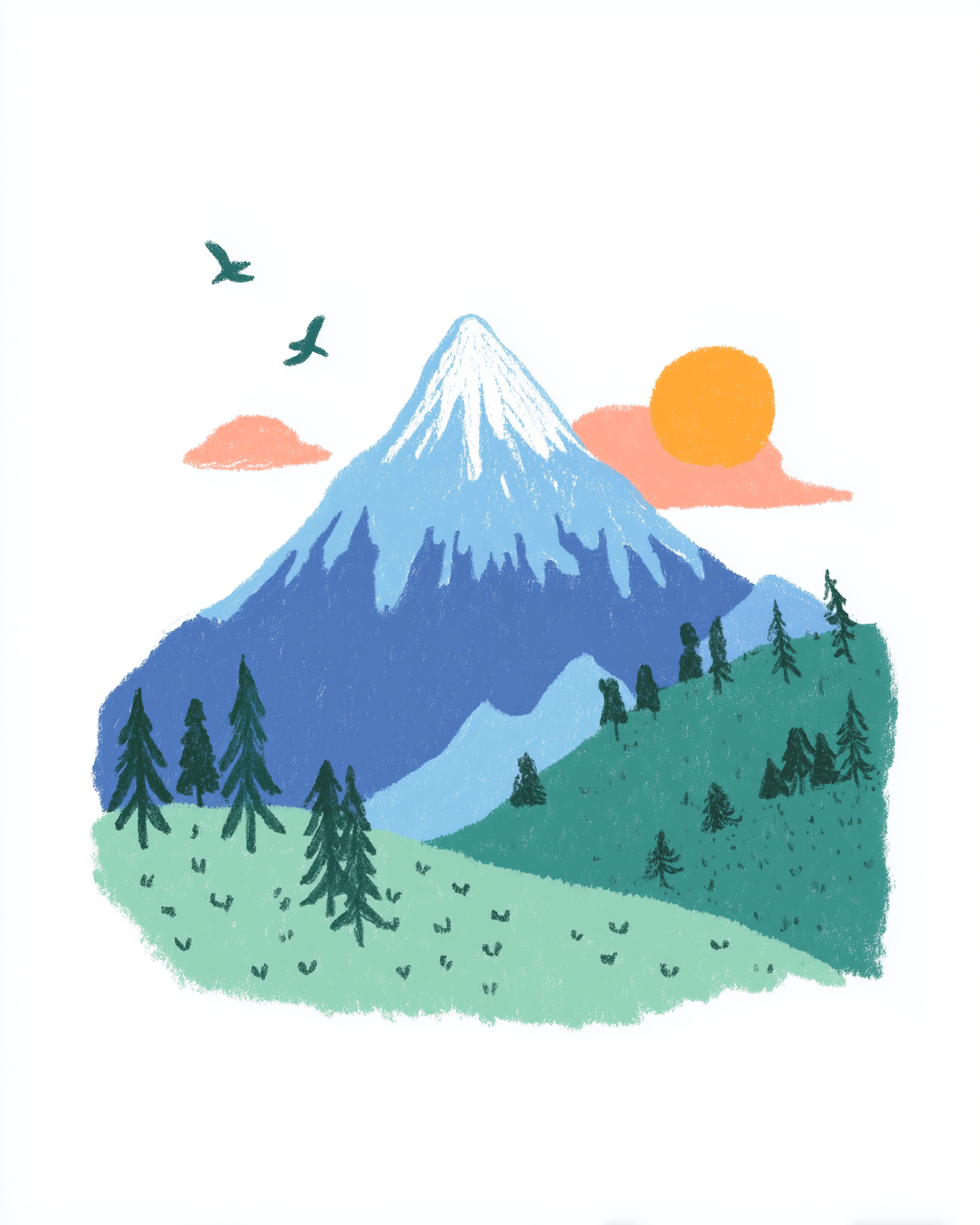 A charming illustration of a snow-capped mountain with green hills, pine trees, and a bright sun in a pastel sky.
