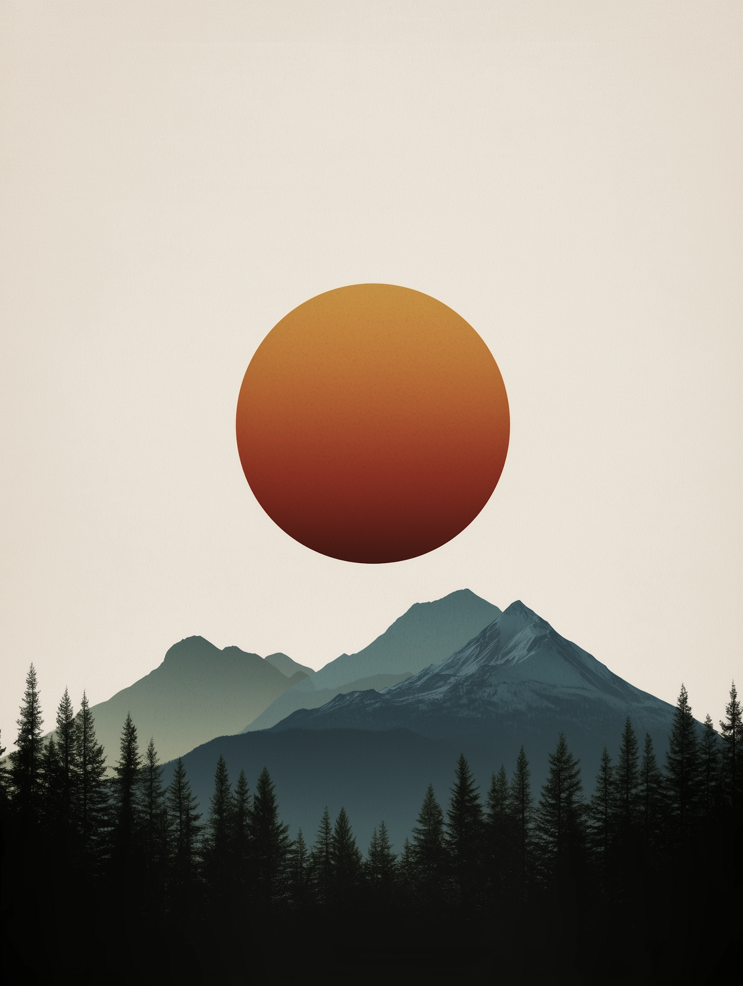 Minimalist mountain landscape with a gradient orange sun, evergreen trees, and layered peaks in muted green and blue tones.