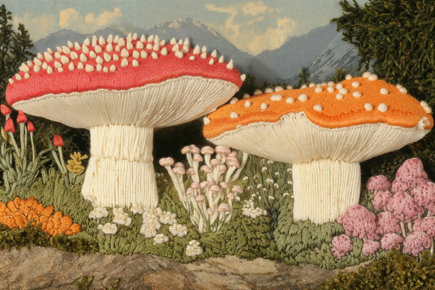 Intricate embroidery of mushrooms with red and orange caps, surrounded by lush plants and flowers, set against a mountain landscape.