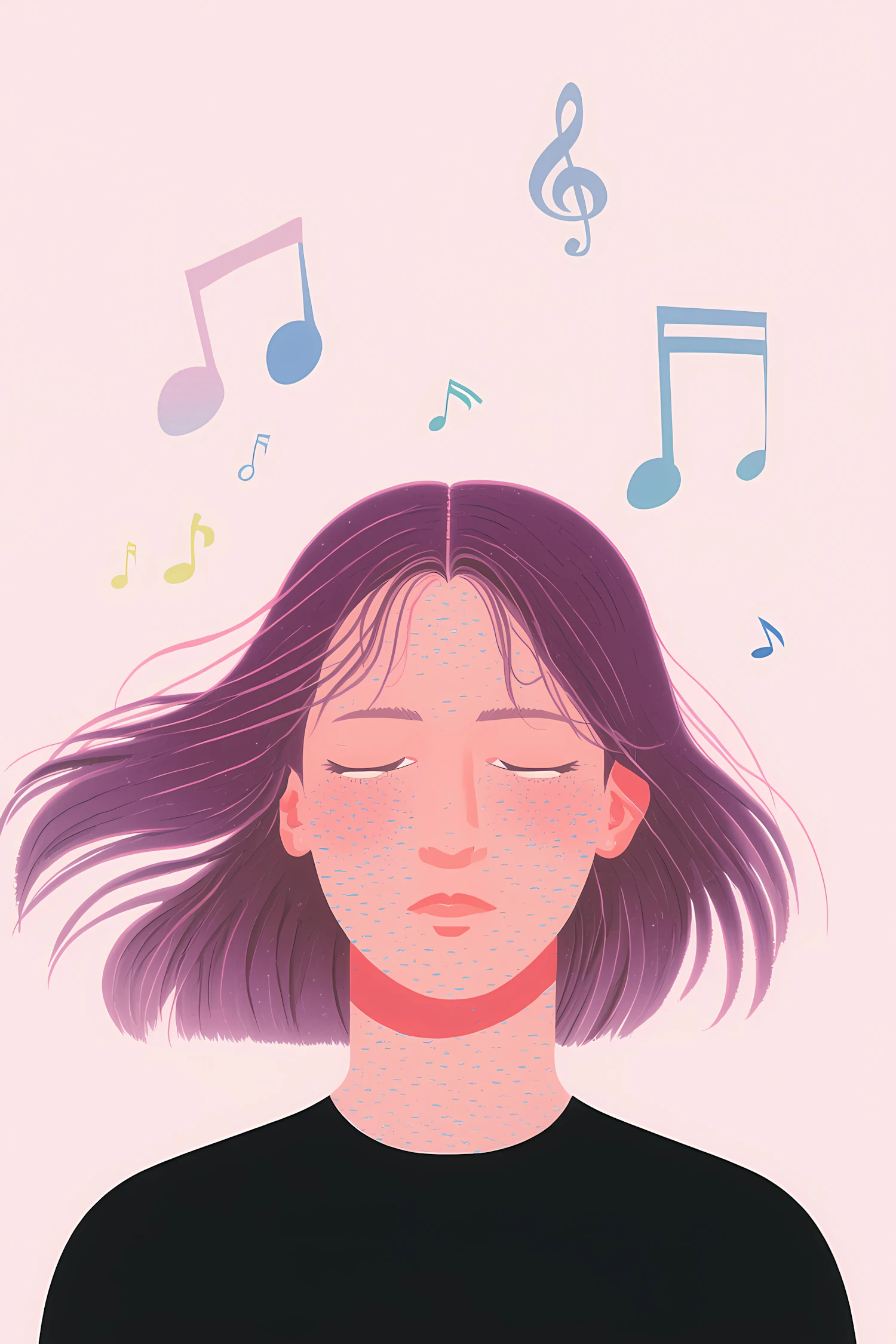 A serene illustration of a person with purple hair, closed eyes, and musical notes floating around, set against a soft pink background.