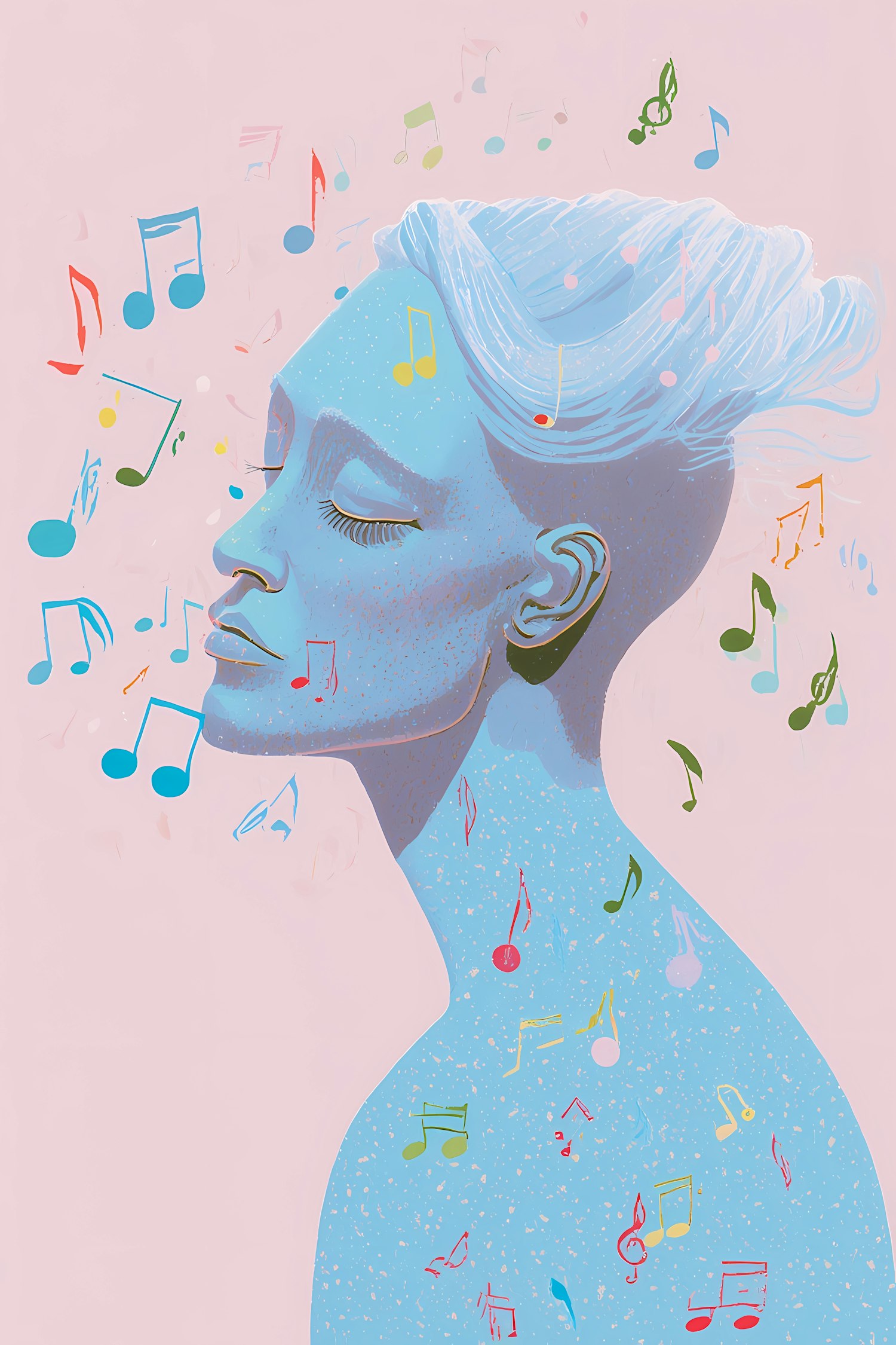 A serene illustration of a blue-skinned figure with white hair surrounded by colorful musical notes on a soft pink background.