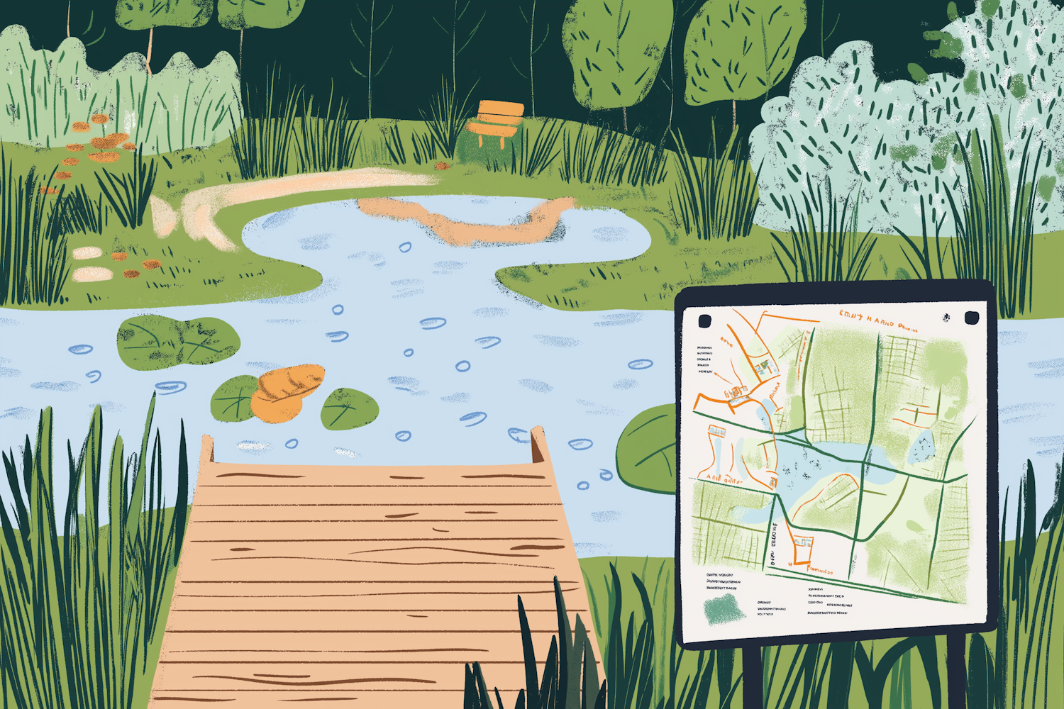 Illustrated nature park scene with a pond, wooden dock, lily pads, a dirt path, and a park map signboard. Perfect for outdoor inspiration.