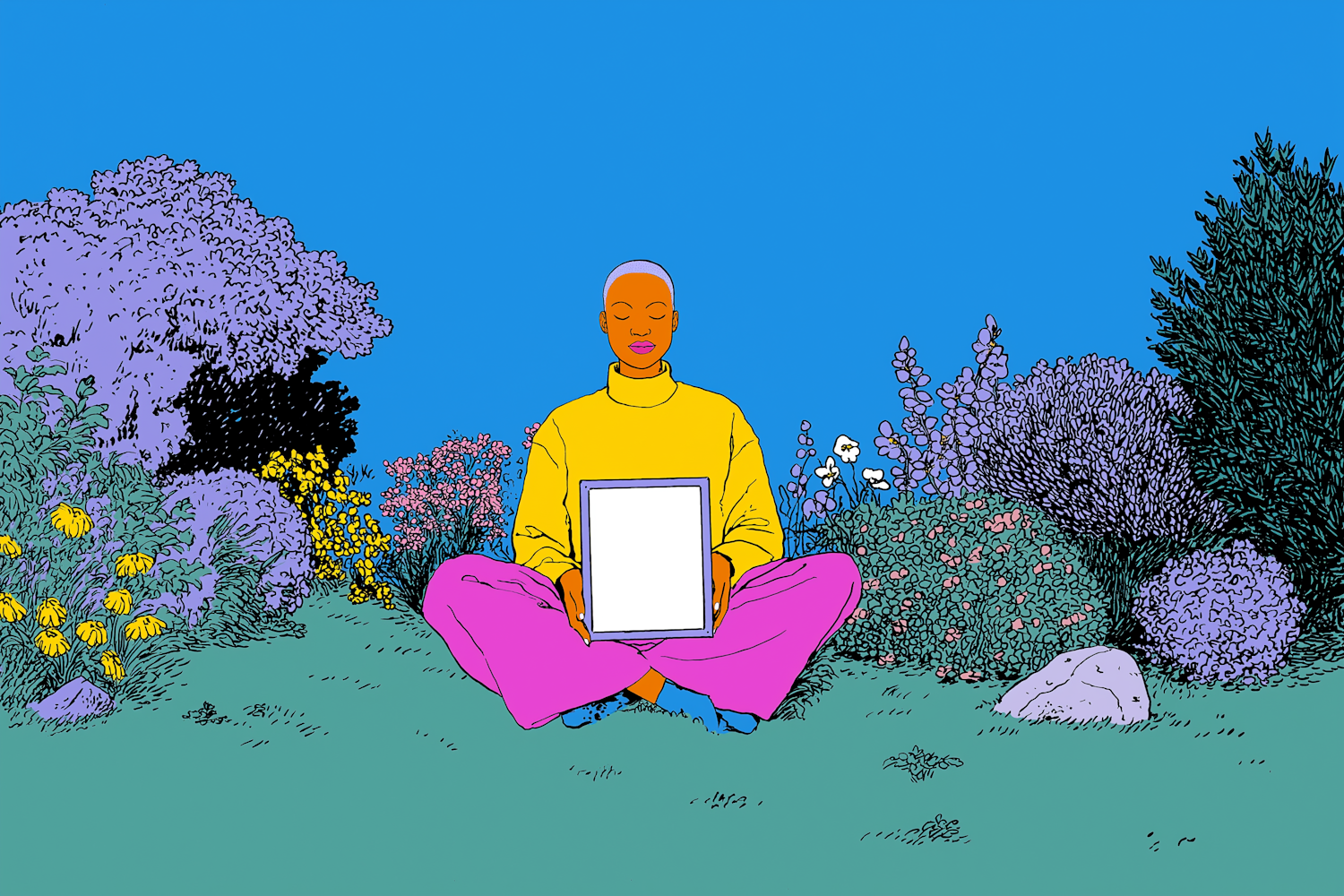 A colorful illustration of a person meditating in a garden, holding a blank frame, surrounded by vibrant flowers and a clear blue sky.