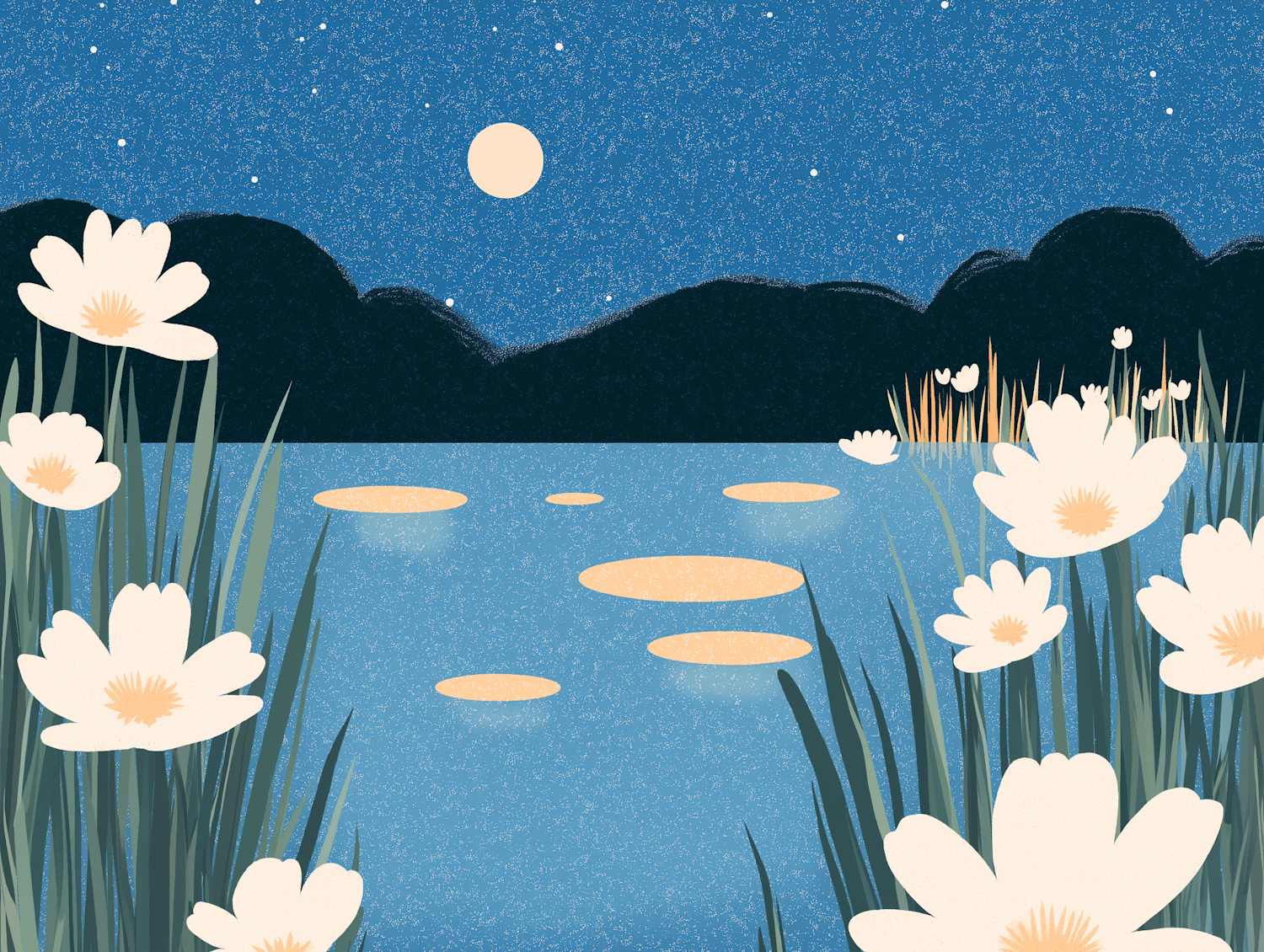 Tranquil night scene with moonlit lake, white flowers, and starry sky. Perfect for a calming and serene atmosphere.