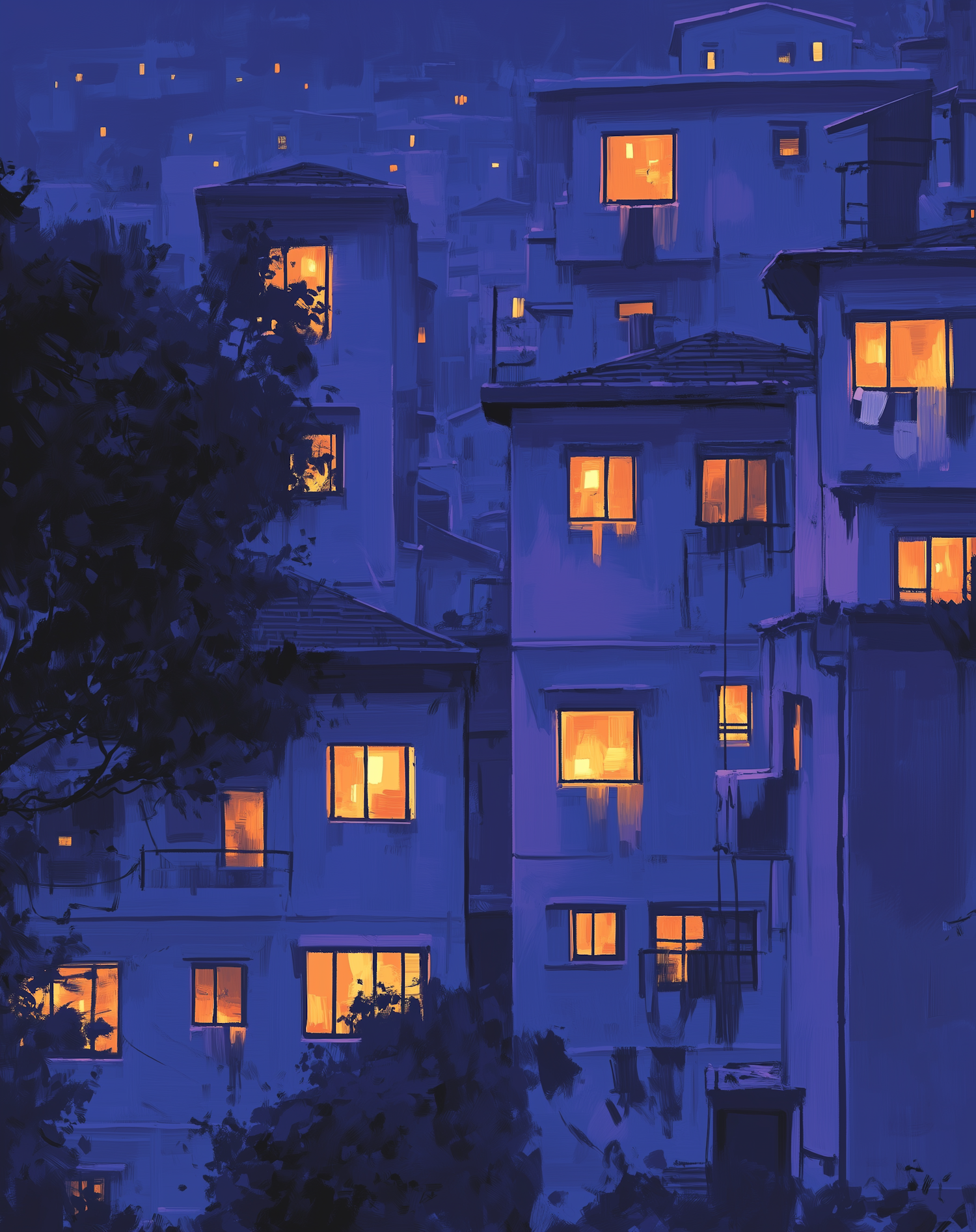 A nighttime cityscape with glowing windows in blue-toned buildings, creating a serene and cozy atmosphere with warm light contrasts.