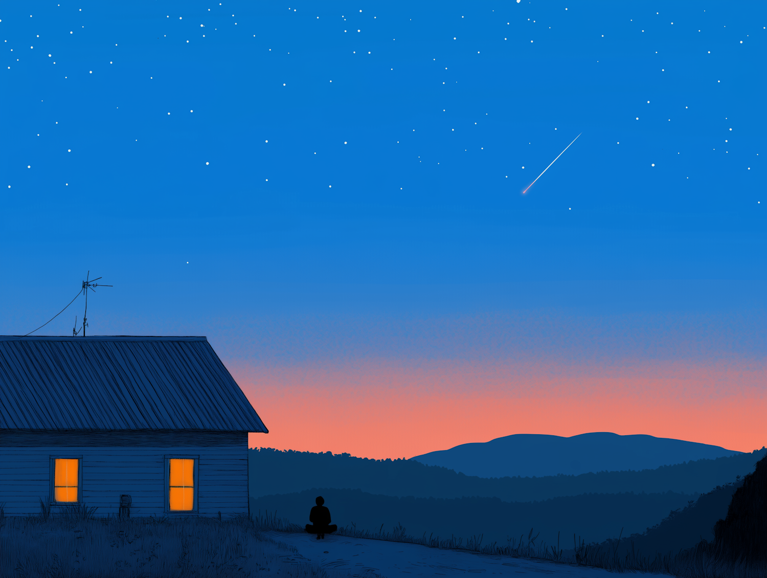 Silhouette of a person sitting by a house under a starry sky with a shooting star, against a backdrop of hills and a glowing horizon.