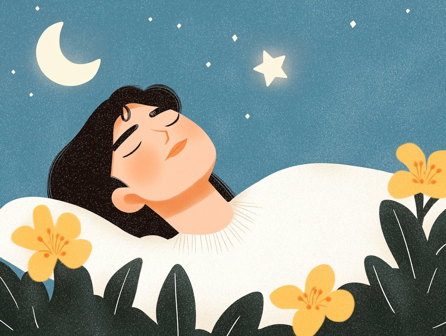 Peaceful illustration of a person sleeping under a starry night sky, surrounded by flowers and leaves, with a crescent moon above.