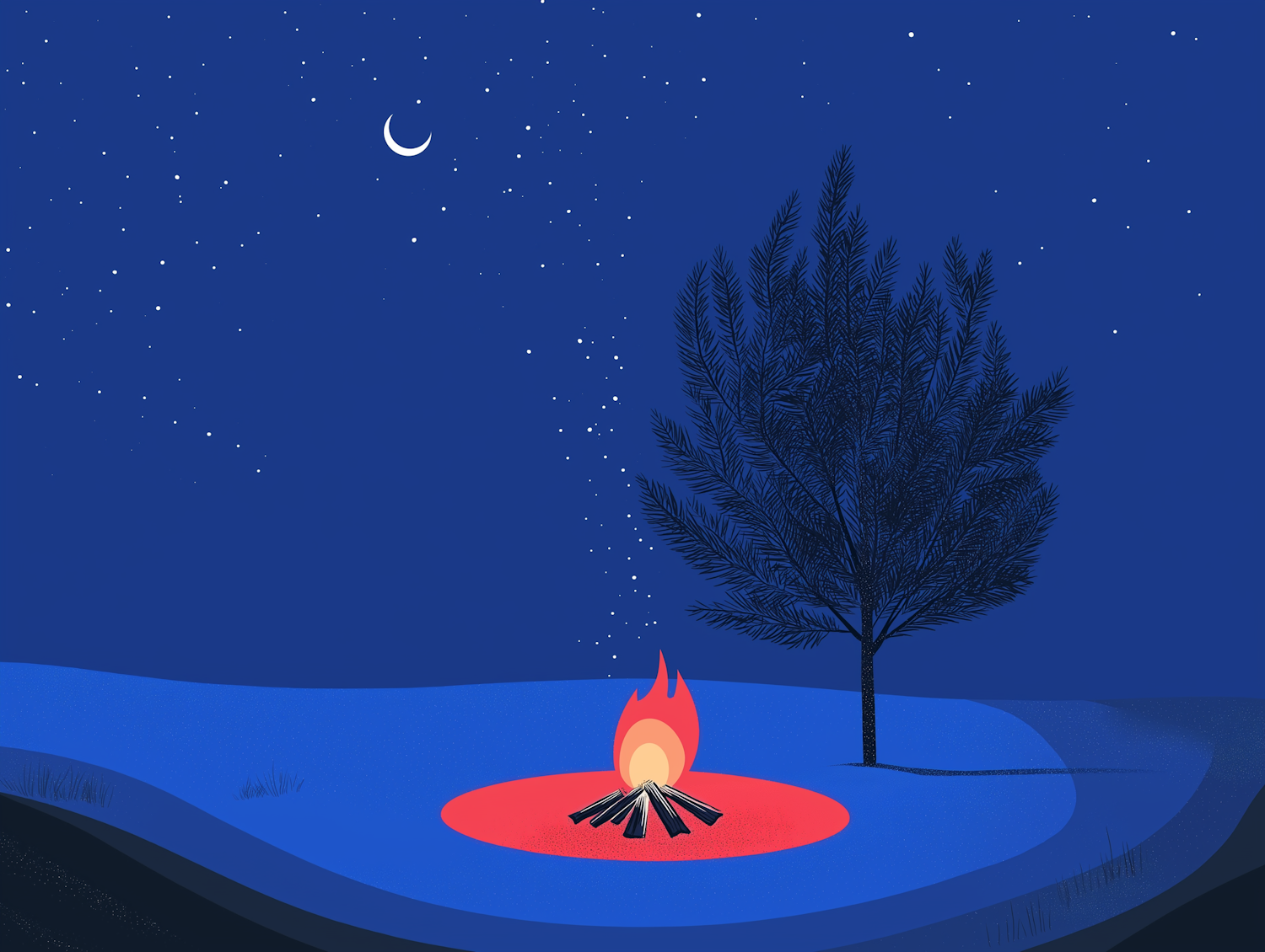 A tranquil night scene with a campfire under a starry sky and crescent moon, featuring a silhouetted tree and rolling blue landscape.