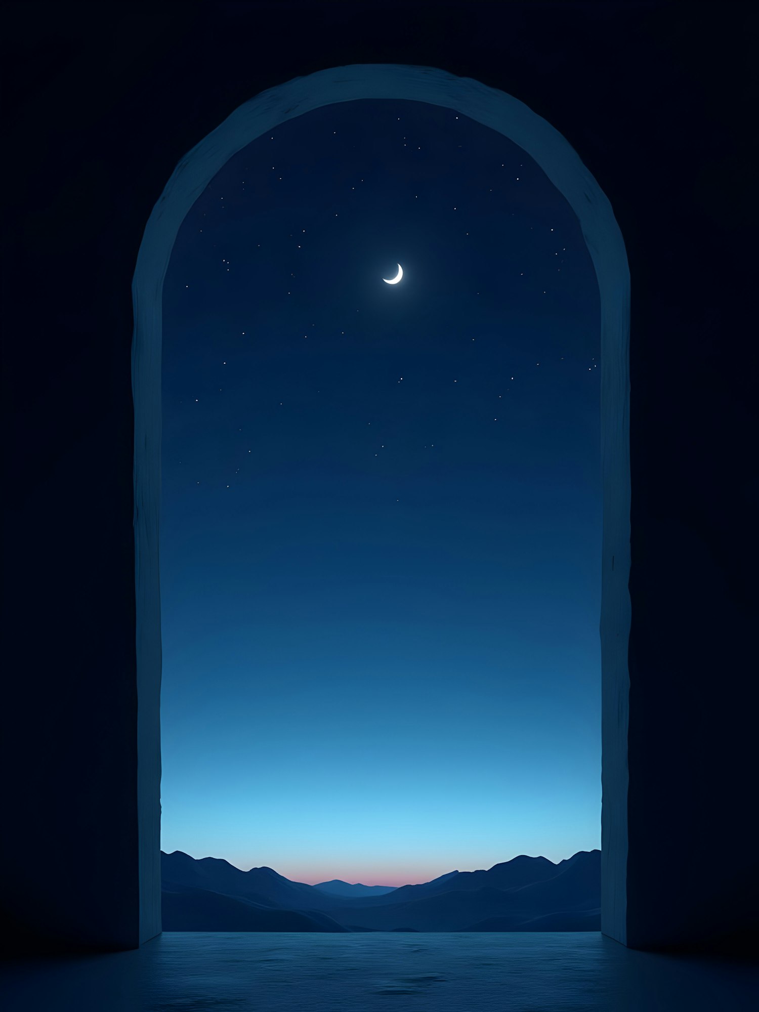 A crescent moon and starry sky framed by an arched doorway, with mountains and a soft horizon glow creating a tranquil nighttime view.