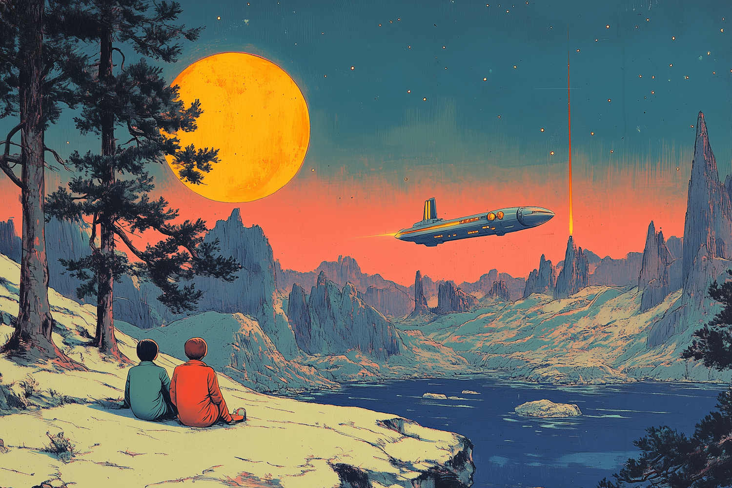 Two figures watch a spaceship fly under a glowing moon in a surreal, colorful landscape with mountains and water.