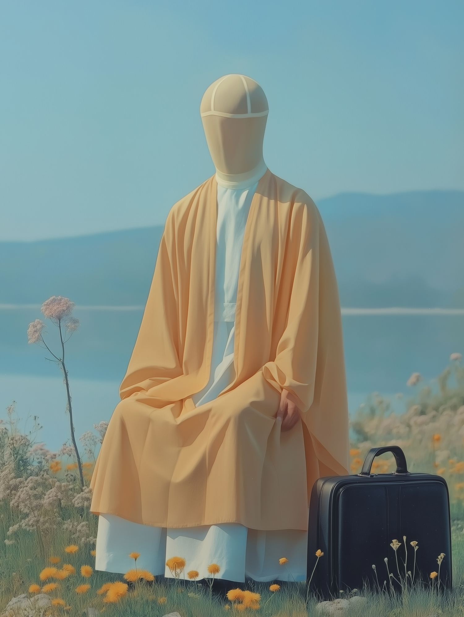 Surreal faceless figure in yellow robe with briefcase, seated in a serene landscape with flowers and a calm lake.