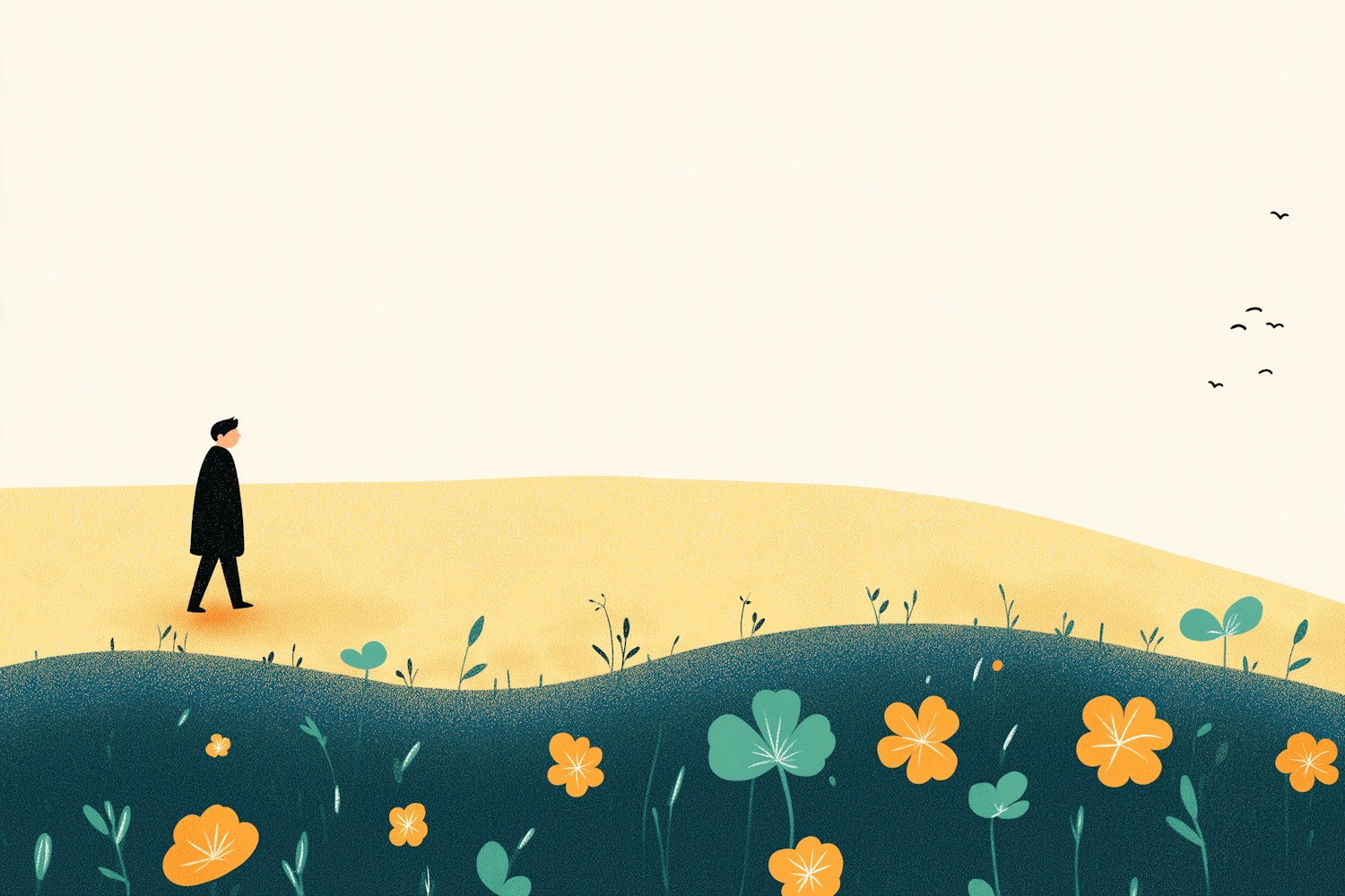 Minimalist illustration of a person walking in a golden field with vibrant orange flowers and a pale sky with birds in the distance.