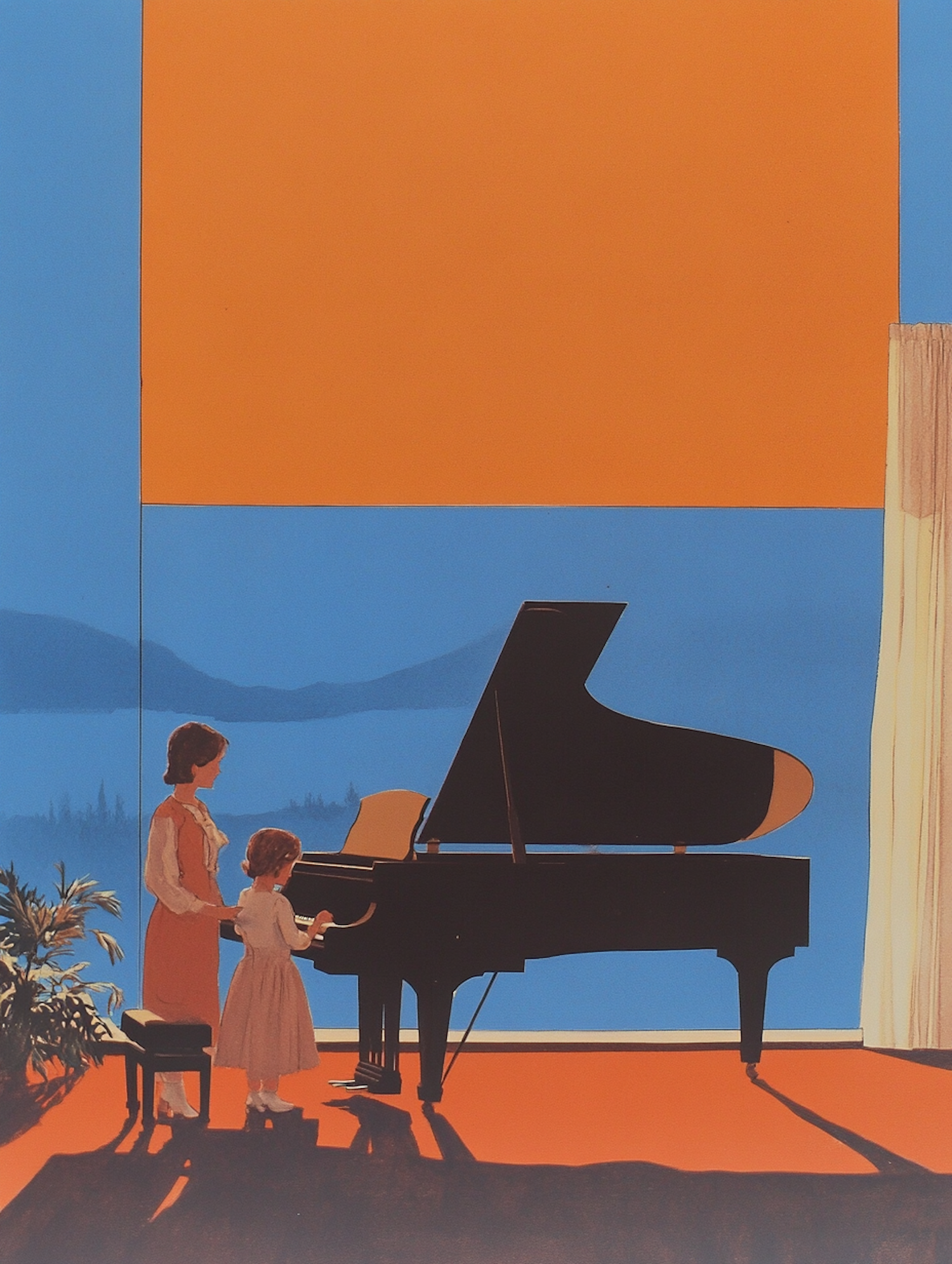 Illustration of a woman and child at a grand piano, set against a vibrant orange and blue backdrop with a lake view.