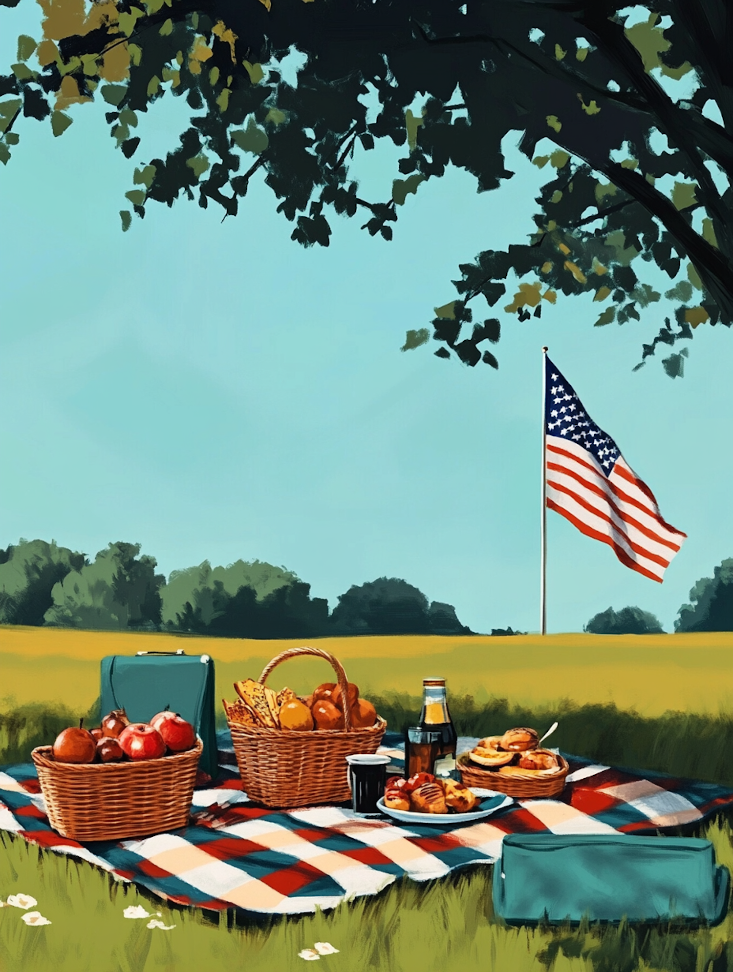 Charming picnic scene with baskets of food on a checkered blanket under a tree, with an American flag waving in the background.