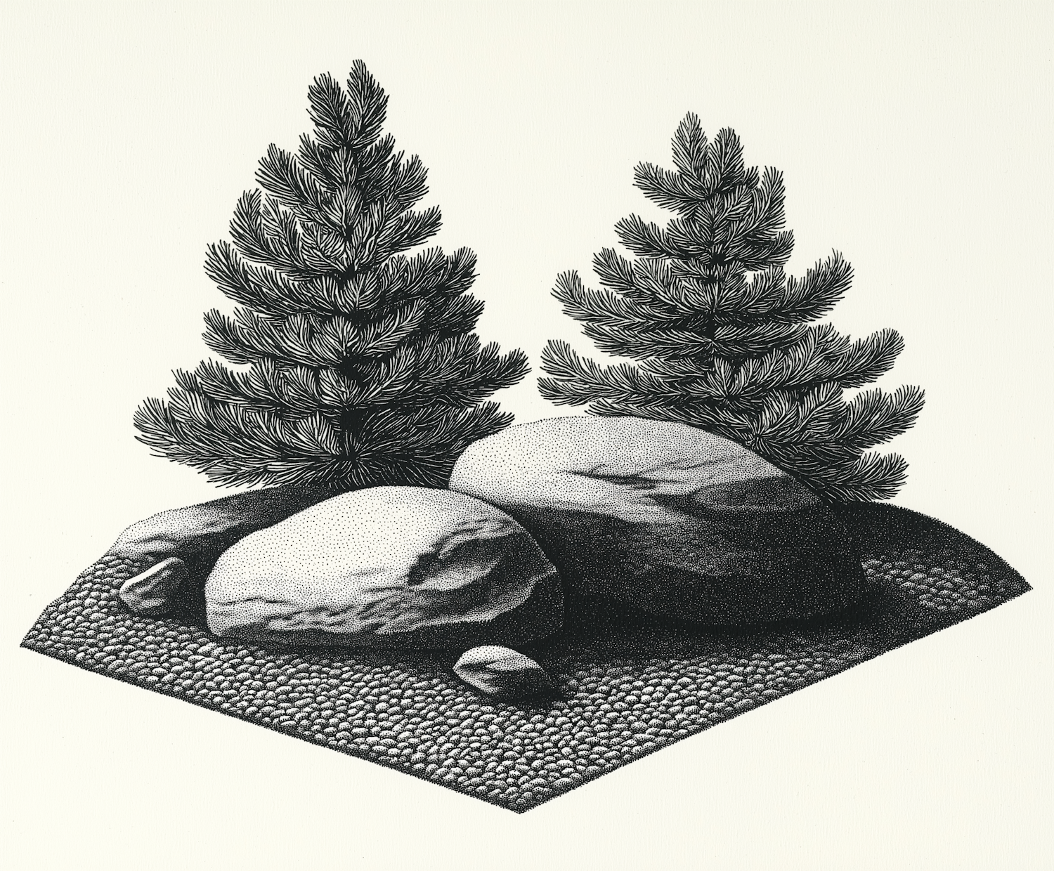 Monochrome illustration of two pine trees with detailed branches, large boulders, and a pebbled ground, showcasing intricate textures.