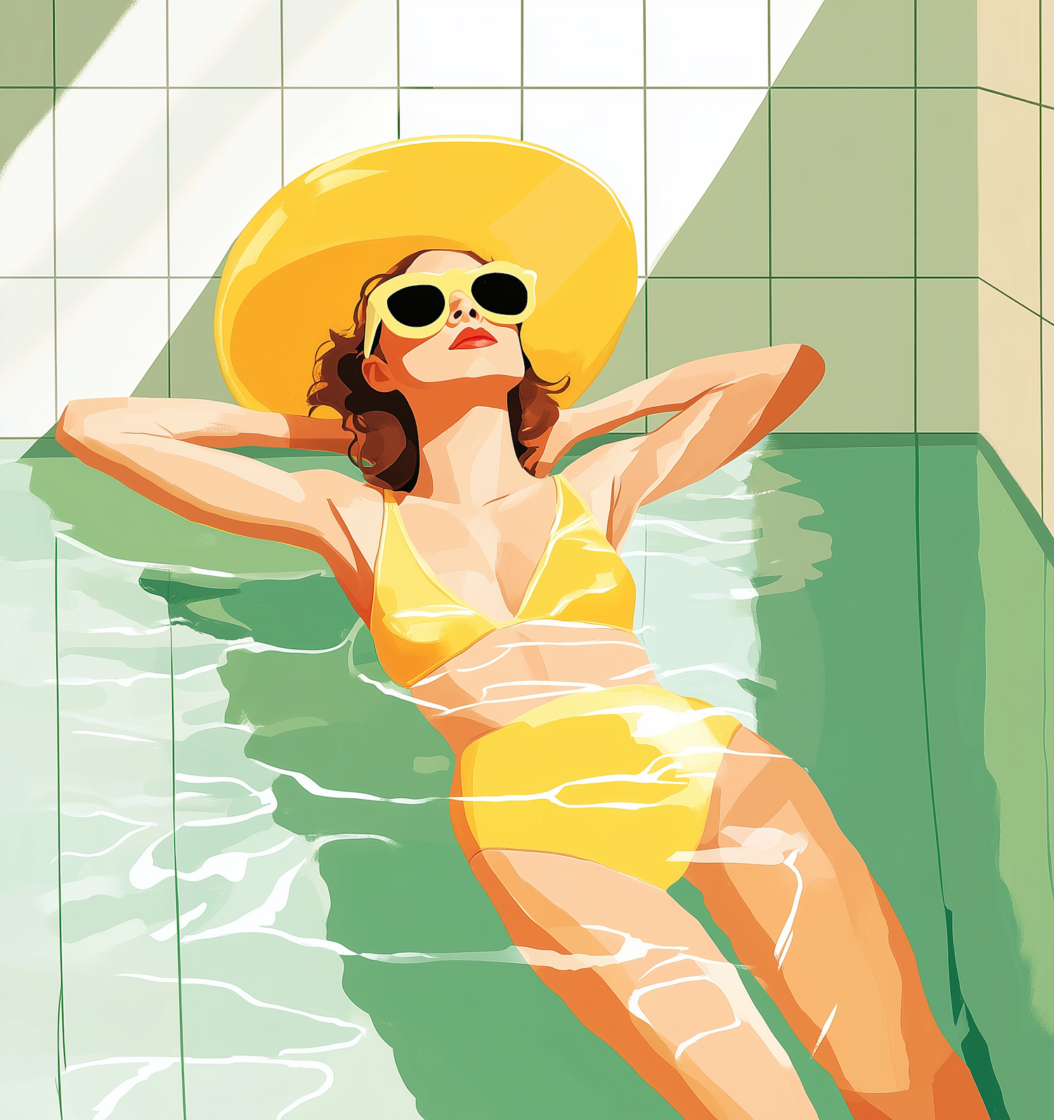 Stylish woman in yellow bikini and hat relaxes in a pool, exuding summer vibes with sunglasses and a tiled backdrop.
