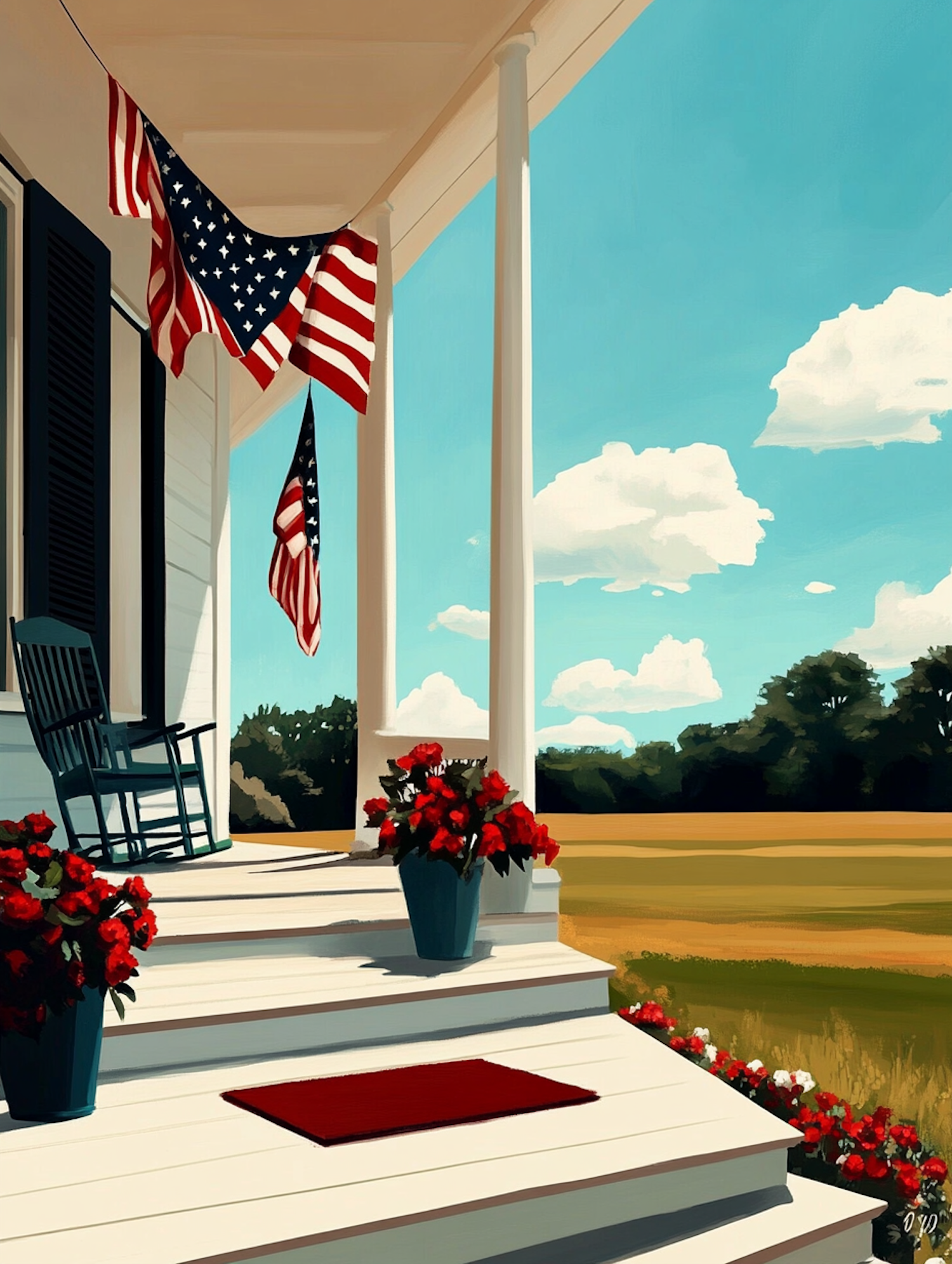Charming porch with American flags, a rocking chair, and vibrant red flowers against a bright blue sky and open field.