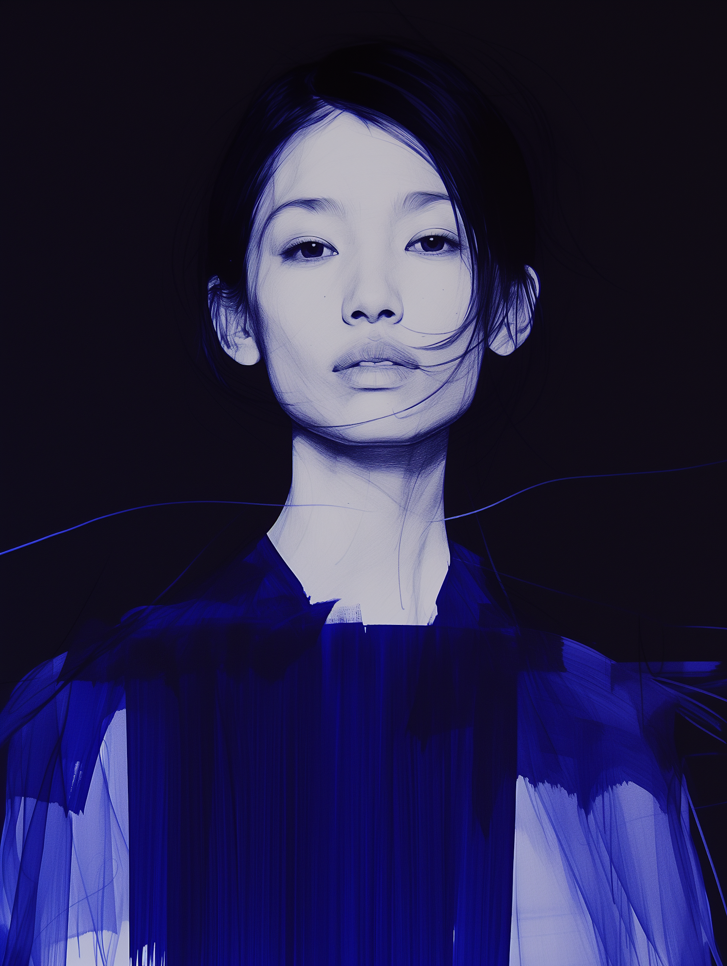 Ethereal portrait of an Asian woman in deep blue hues, with serene expression and abstract flowing garment.