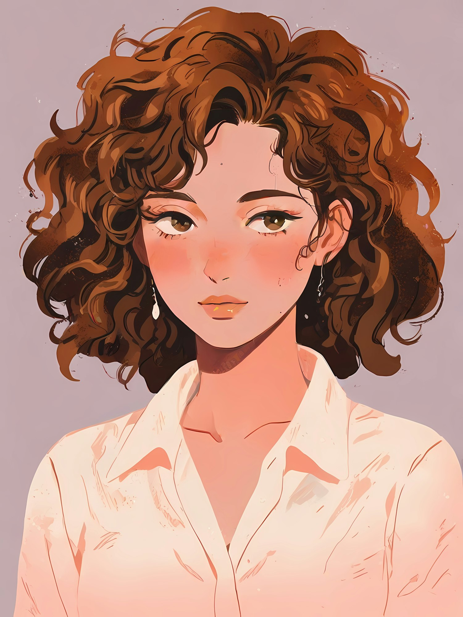 Illustration of a young woman with curly brown hair and expressive eyes, wearing a white shirt against a muted gray background.