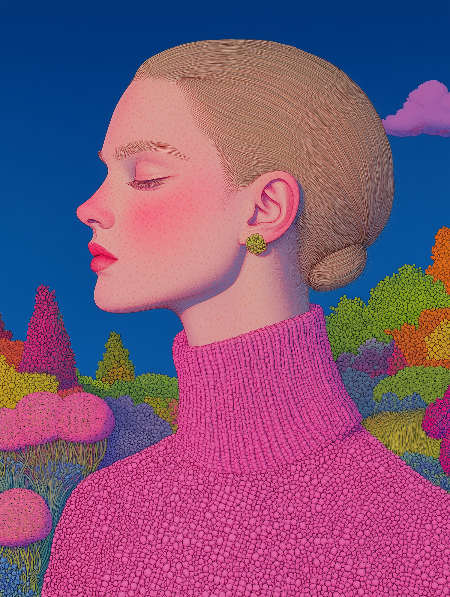 Stylized illustration of a serene woman in a pink sweater against a colorful, abstract landscape.