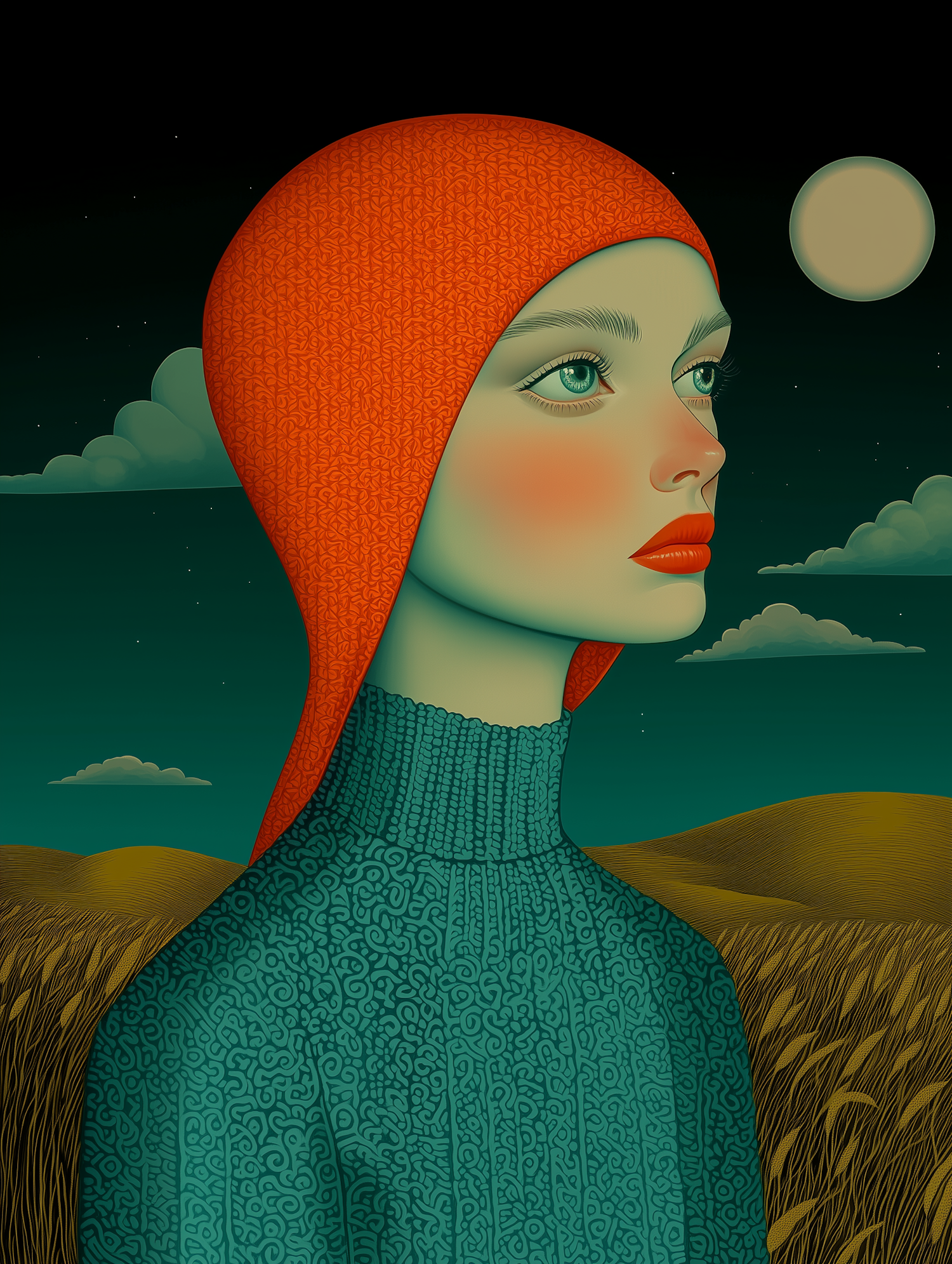 Stylized illustration of a woman with green skin, orange headscarf, and teal sweater against a moonlit landscape.