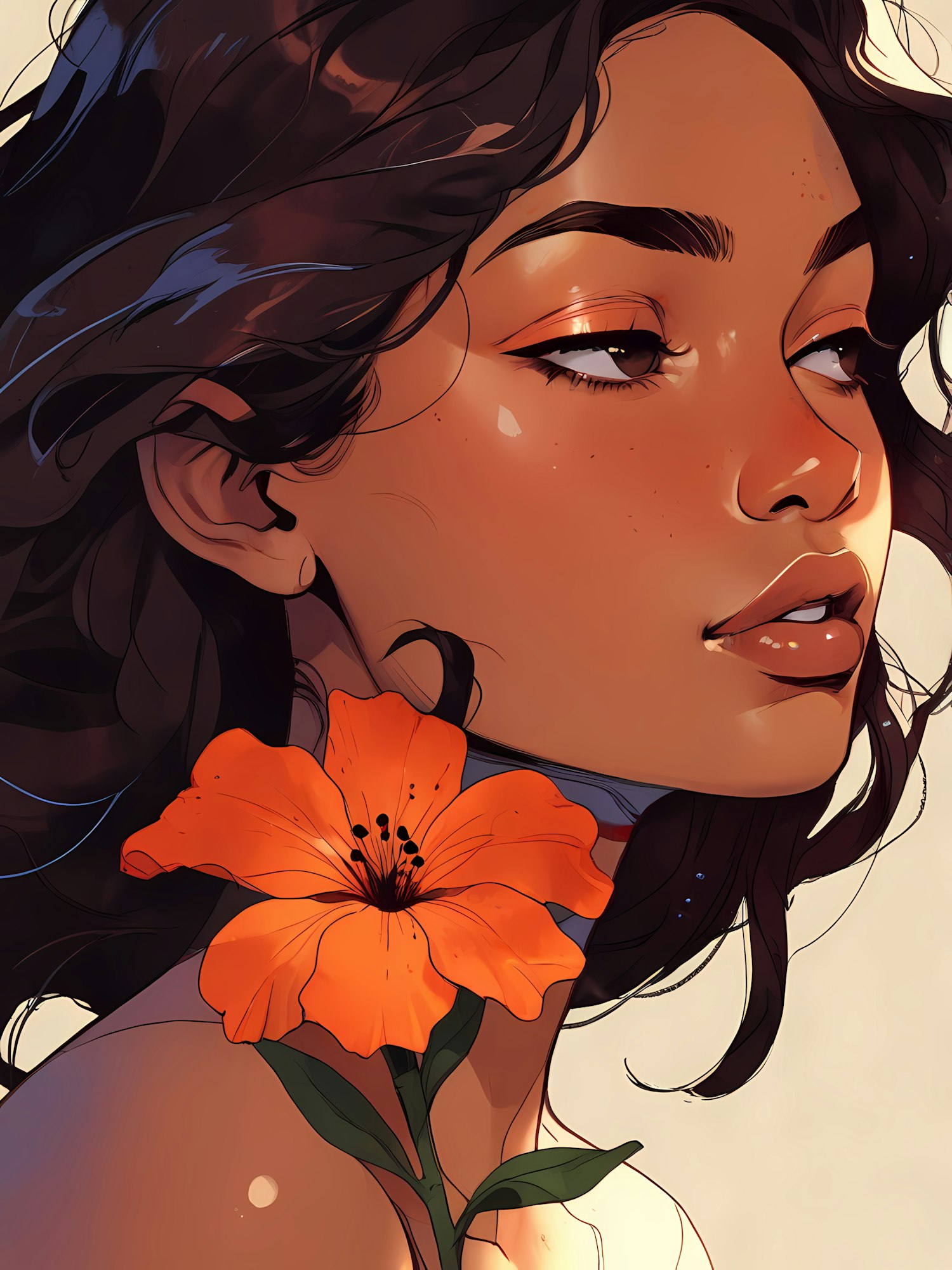 Elegant illustration of a serene woman with dark hair and an orange lily, showcasing natural beauty and tranquility.