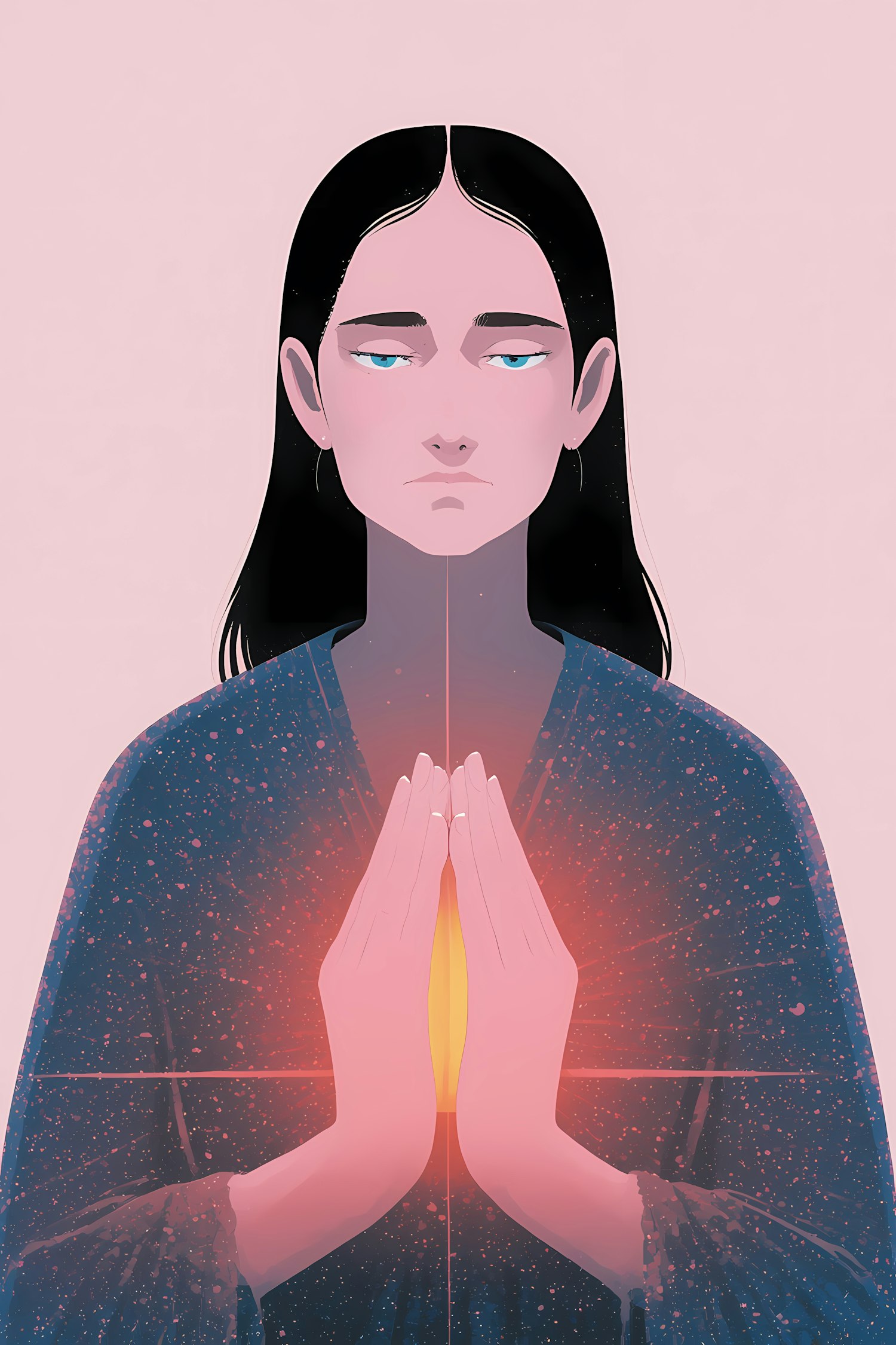A serene illustration of a person in prayer, hands glowing warmly, set against a soft pink background with a starry-patterned garment.