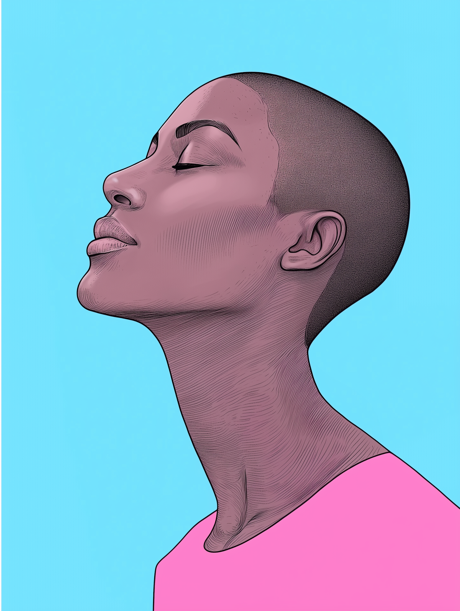 Serene digital illustration of a person with a shaved head, eyes closed, against a light blue background. Vibrant and peaceful.