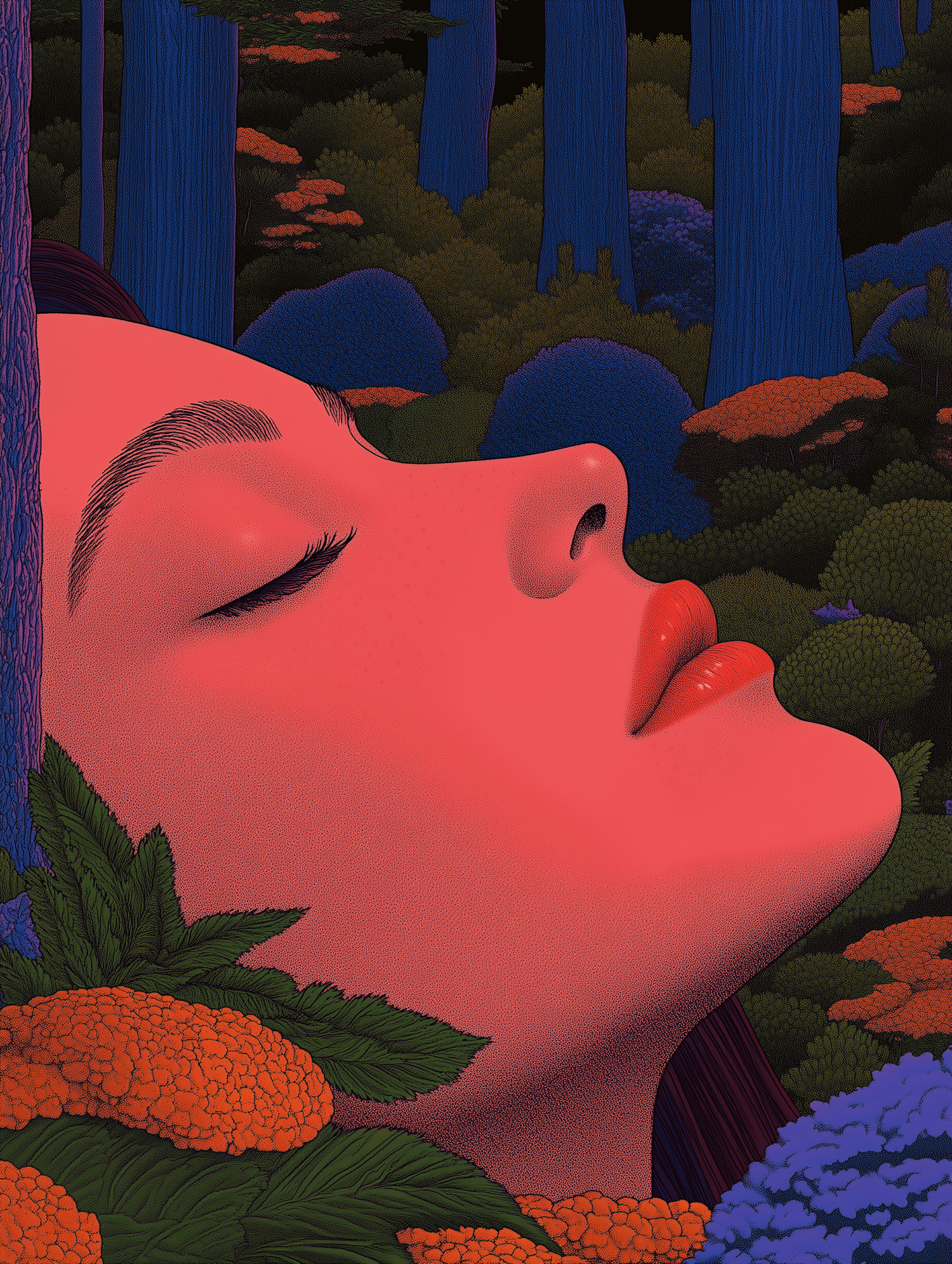 Surreal illustration of a woman's face in a vibrant forest, blending pink skin with blue trees and orange flowers.