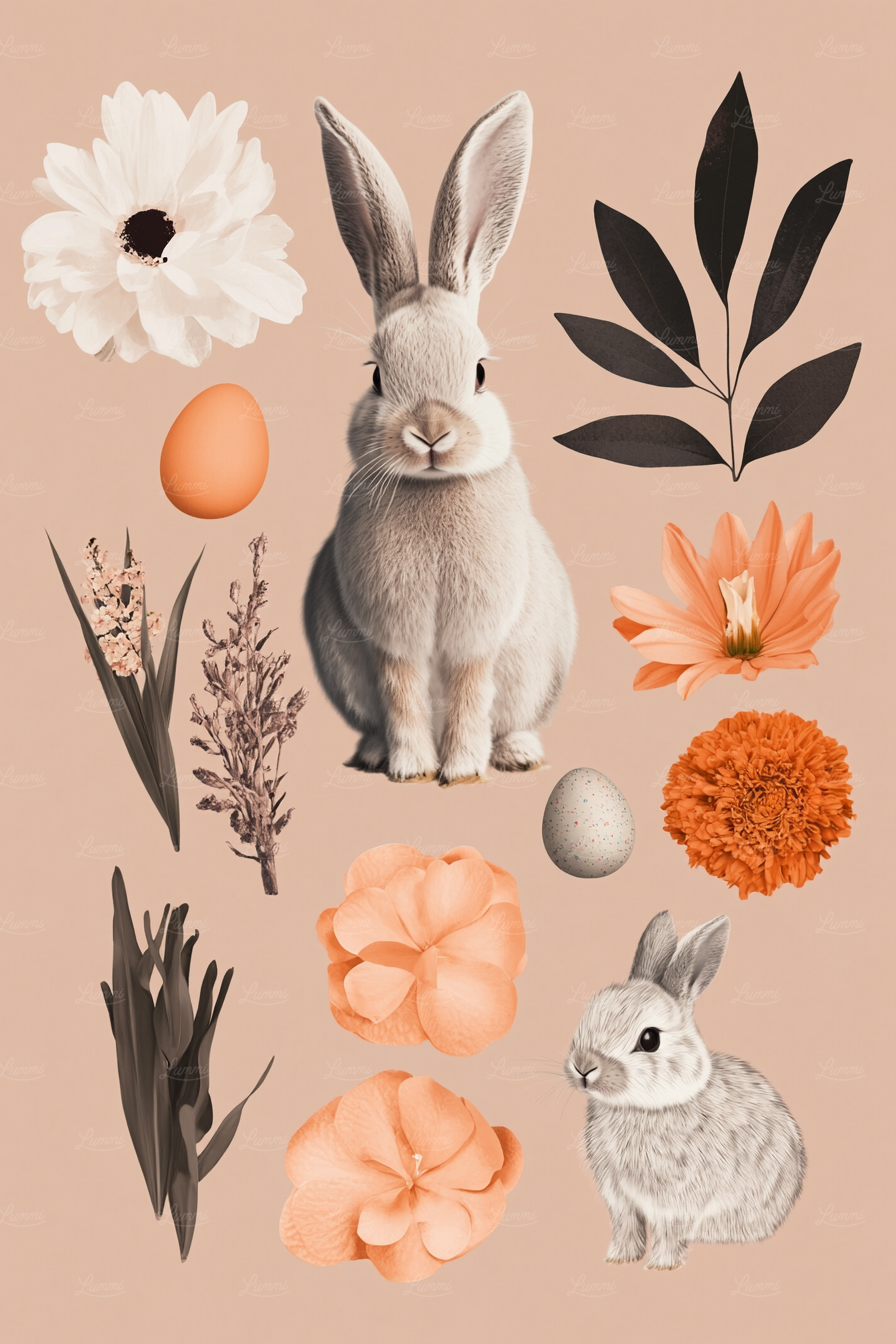 Illustration of a white rabbit surrounded by flowers, leaves, and eggs on a beige background, creating a warm, natural composition.