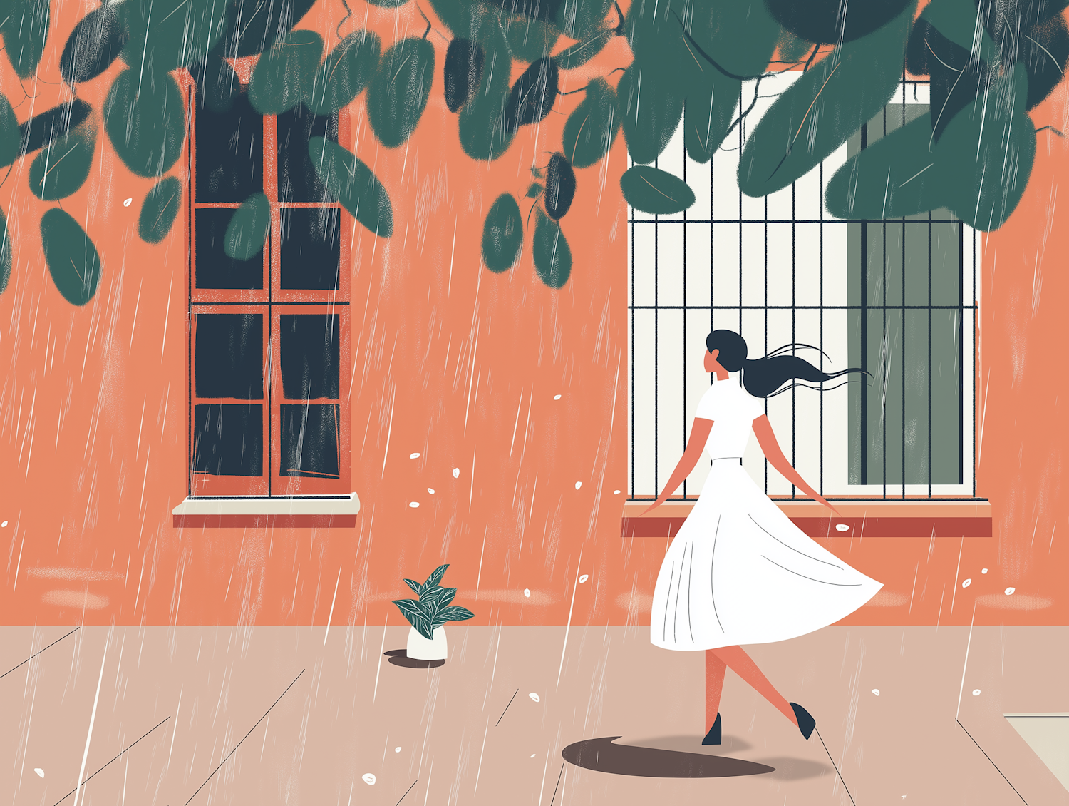 Elegant woman in white dress walks in rain by orange wall with windows and green leaves. Serene and refreshing urban scene.