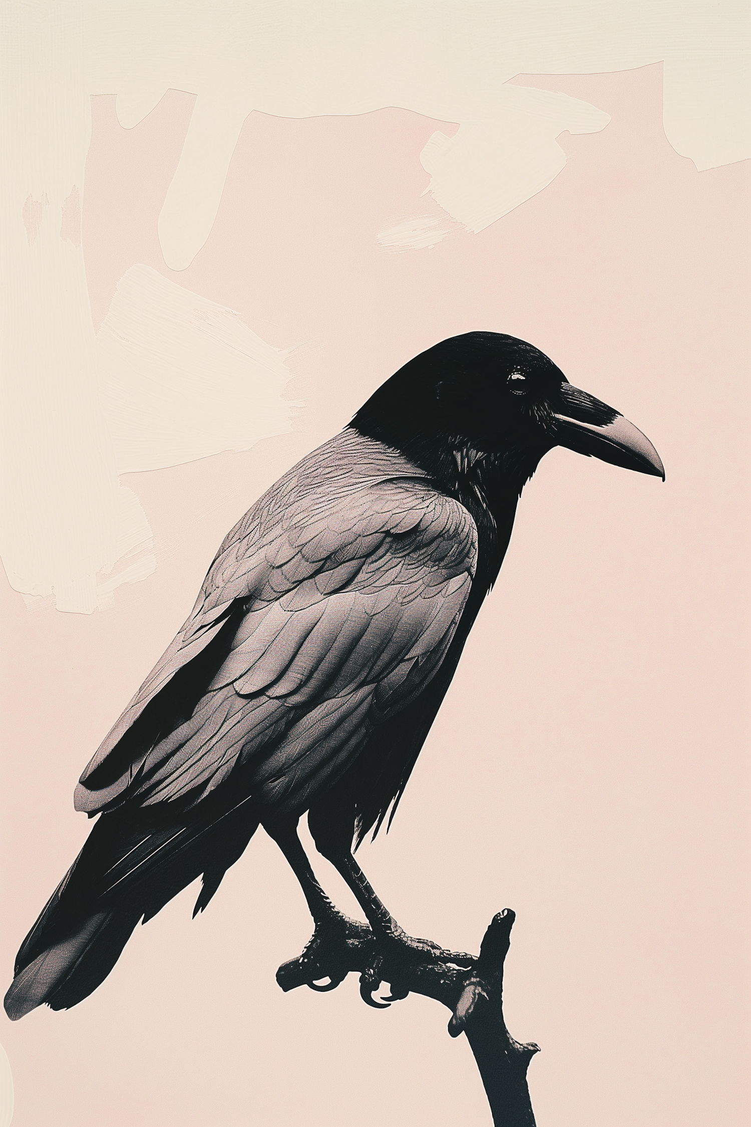 Elegant raven illustration on a pastel background, showcasing detailed feathers and a serene atmosphere.