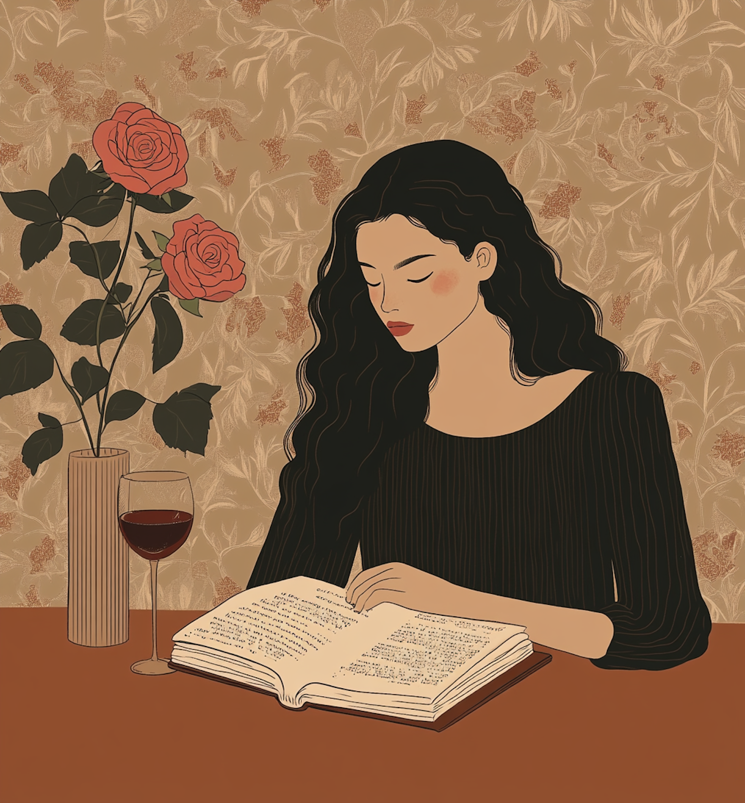 Illustration of a woman reading with a glass of wine and roses, set against a floral wallpaper. Serene and elegant atmosphere.