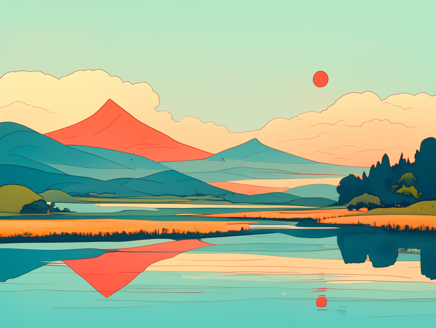 Vibrant landscape illustration with red mountains, teal hills, and a reflective lake under a peach sky with a red sun.