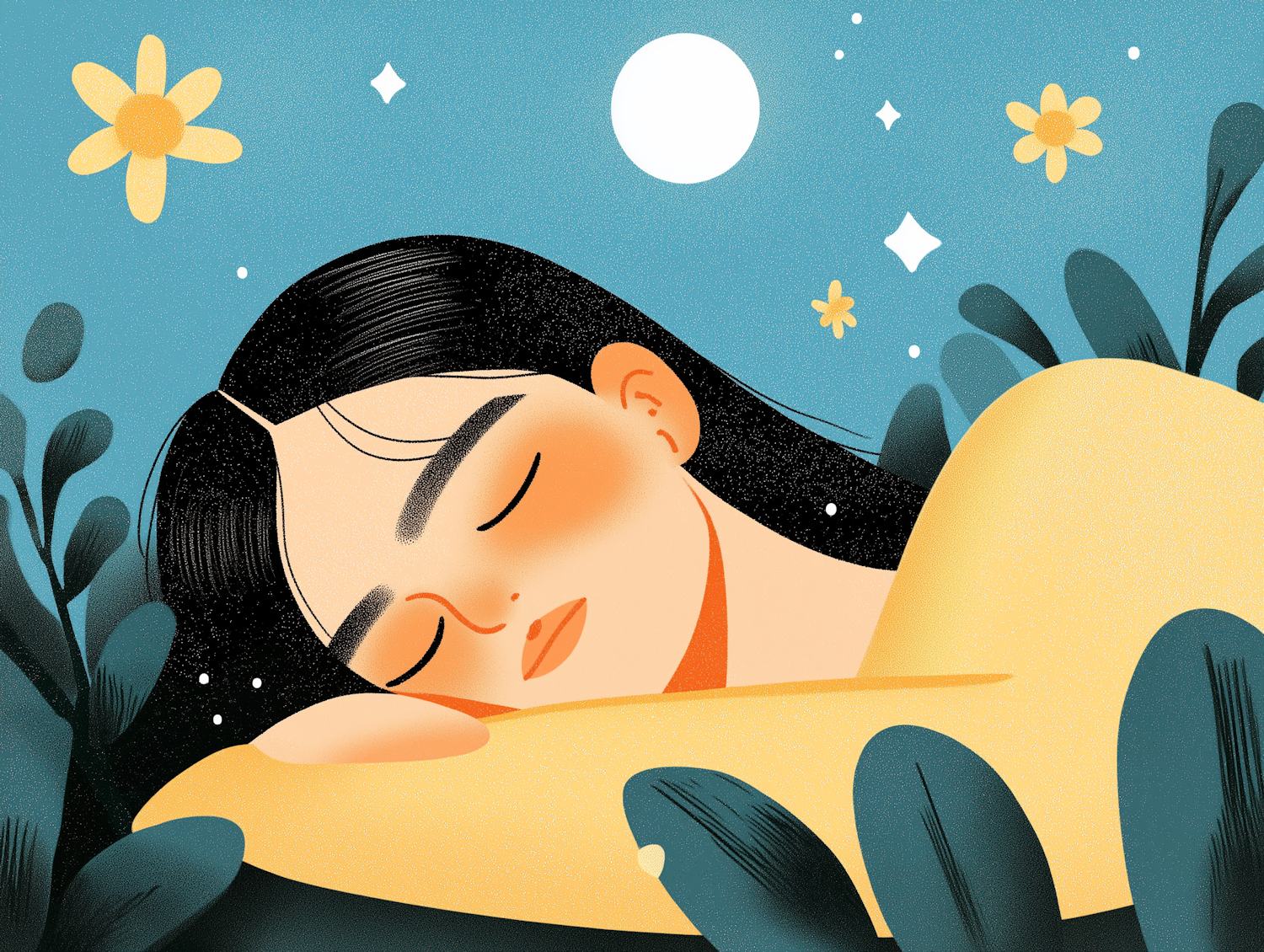 Peaceful illustration of a person sleeping under a starry sky, surrounded by flowers and leaves. Dreamy and serene atmosphere.