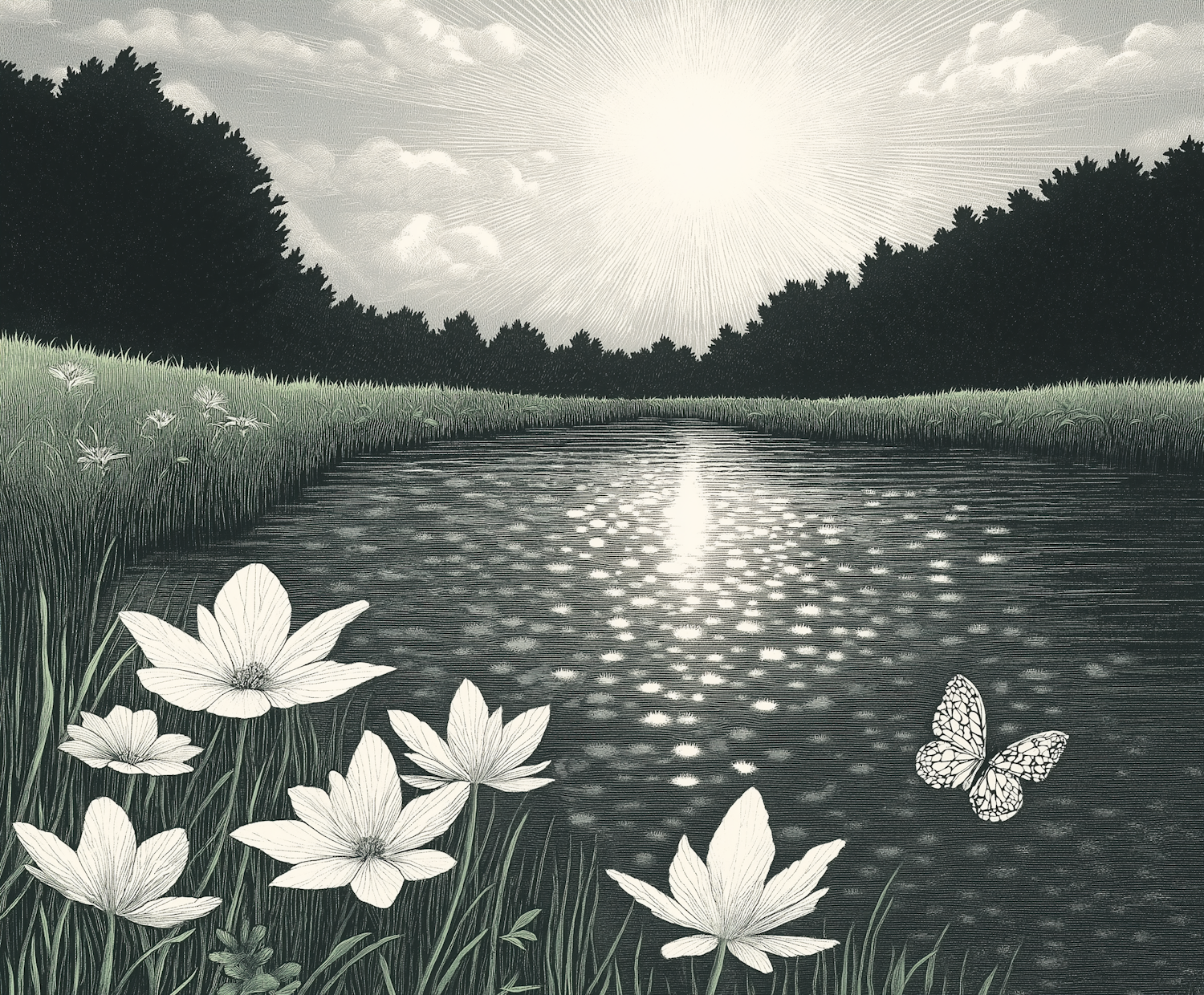 Serene river landscape with sunlit reflections, white flowers, and a butterfly. Lush greenery and trees create a tranquil scene.
