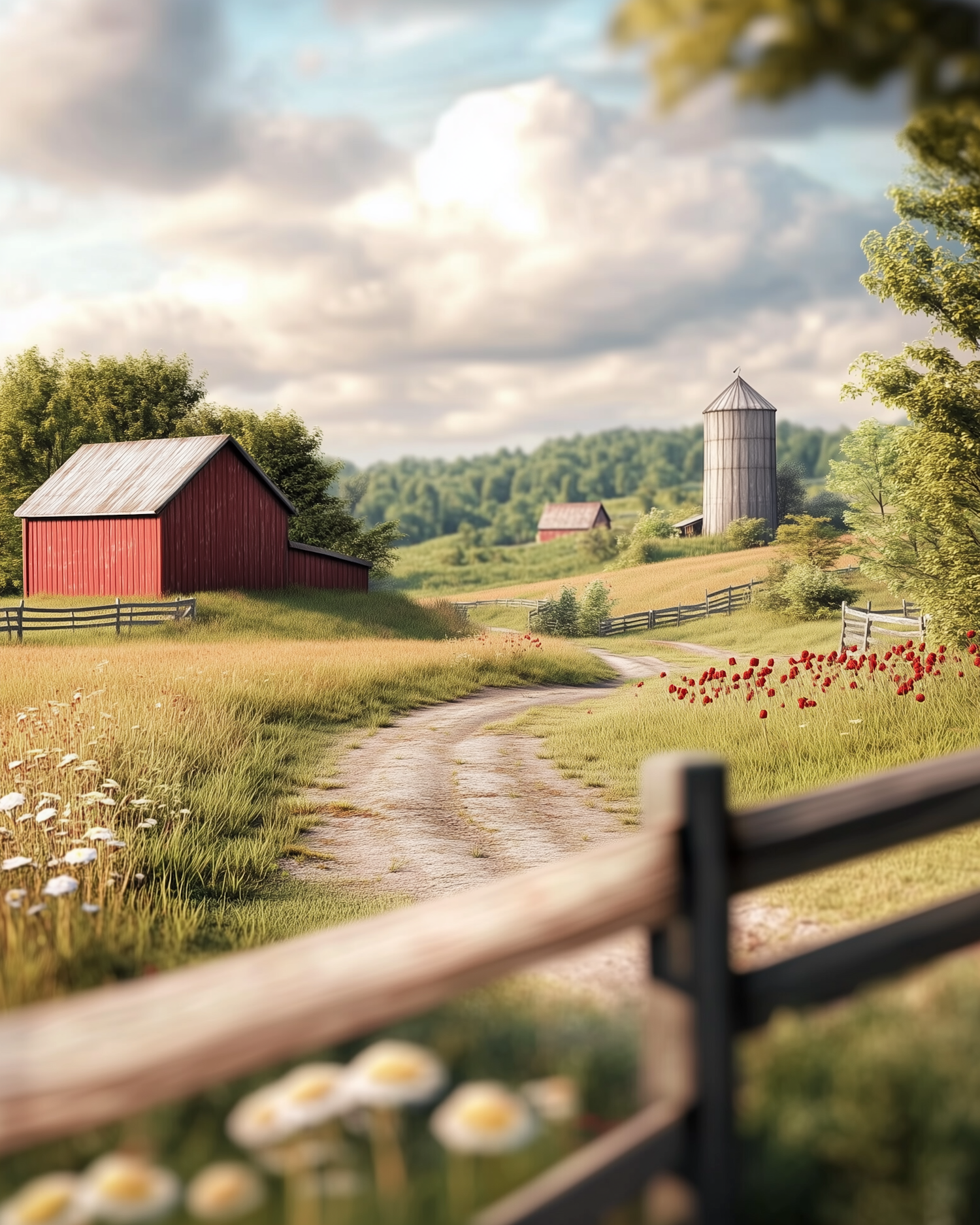 Idyllic countryside scene with a red barn, silo, wildflowers, and a winding dirt path under a bright sky with fluffy clouds.
