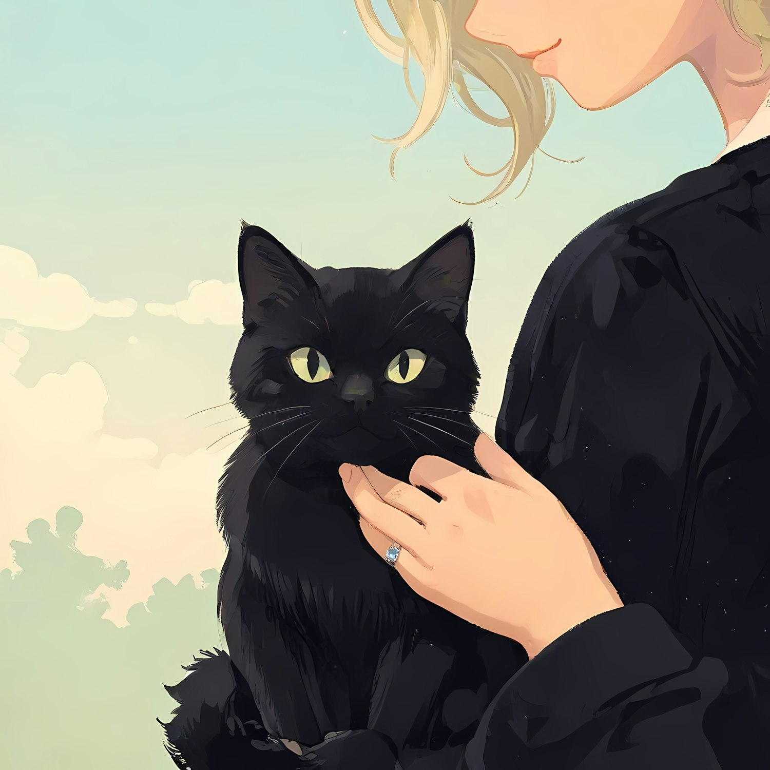 Illustration of a person with blonde hair holding a black cat against a pastel sky. The cat's yellow eyes and a blue ring stand out.