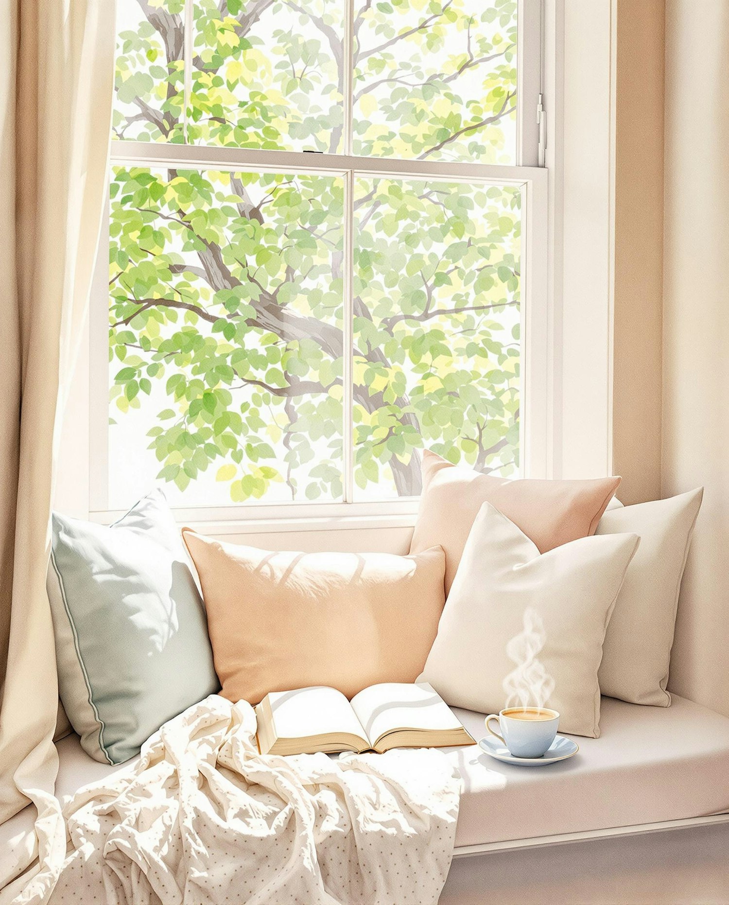Cozy seating nook with pastel cushions, a light blanket, an open book, and a cup of tea by a sunlit window with a view of greenery.