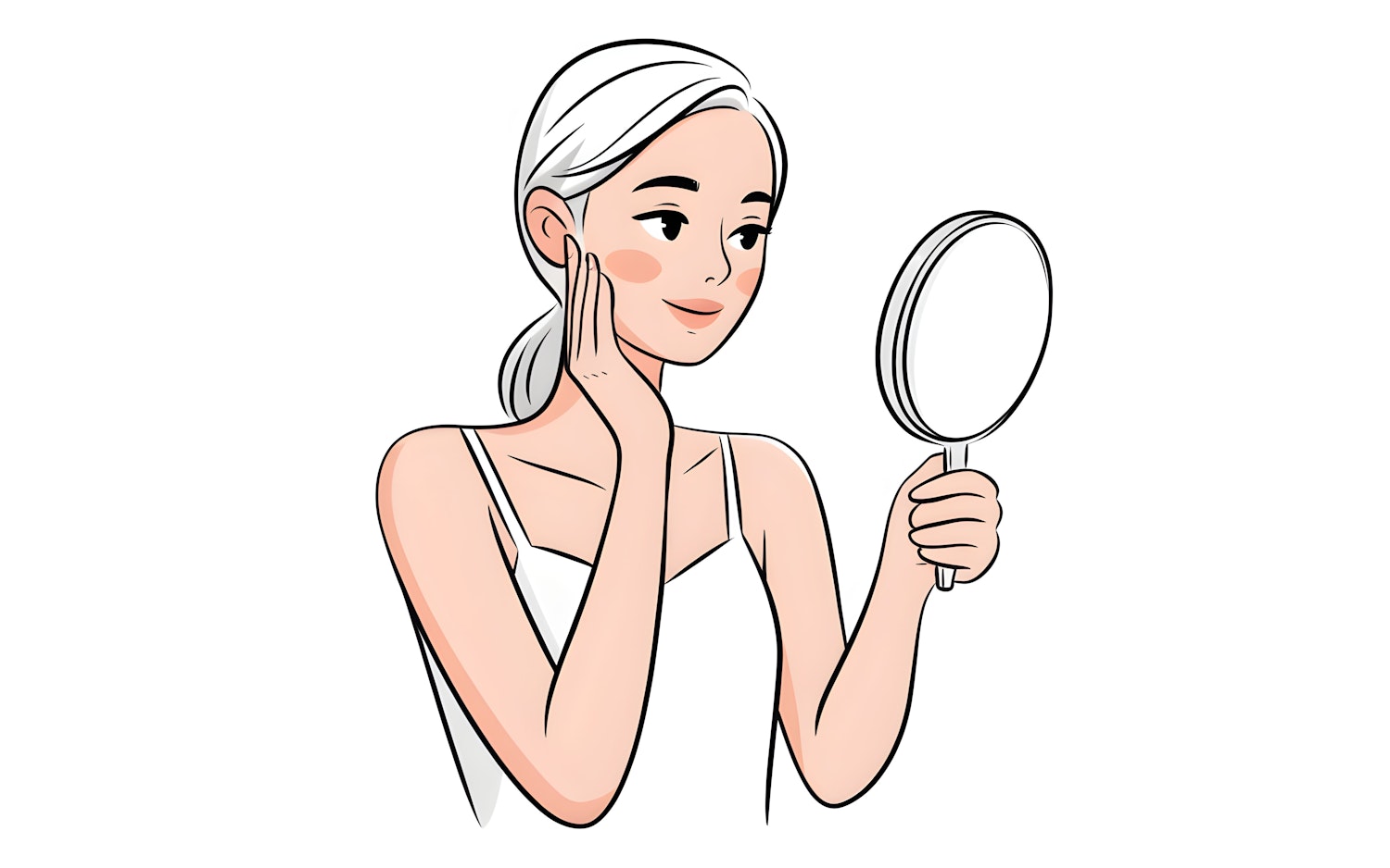 Cartoon illustration of a woman examining her face in a handheld mirror, wearing a white top with sleek hair tied back.