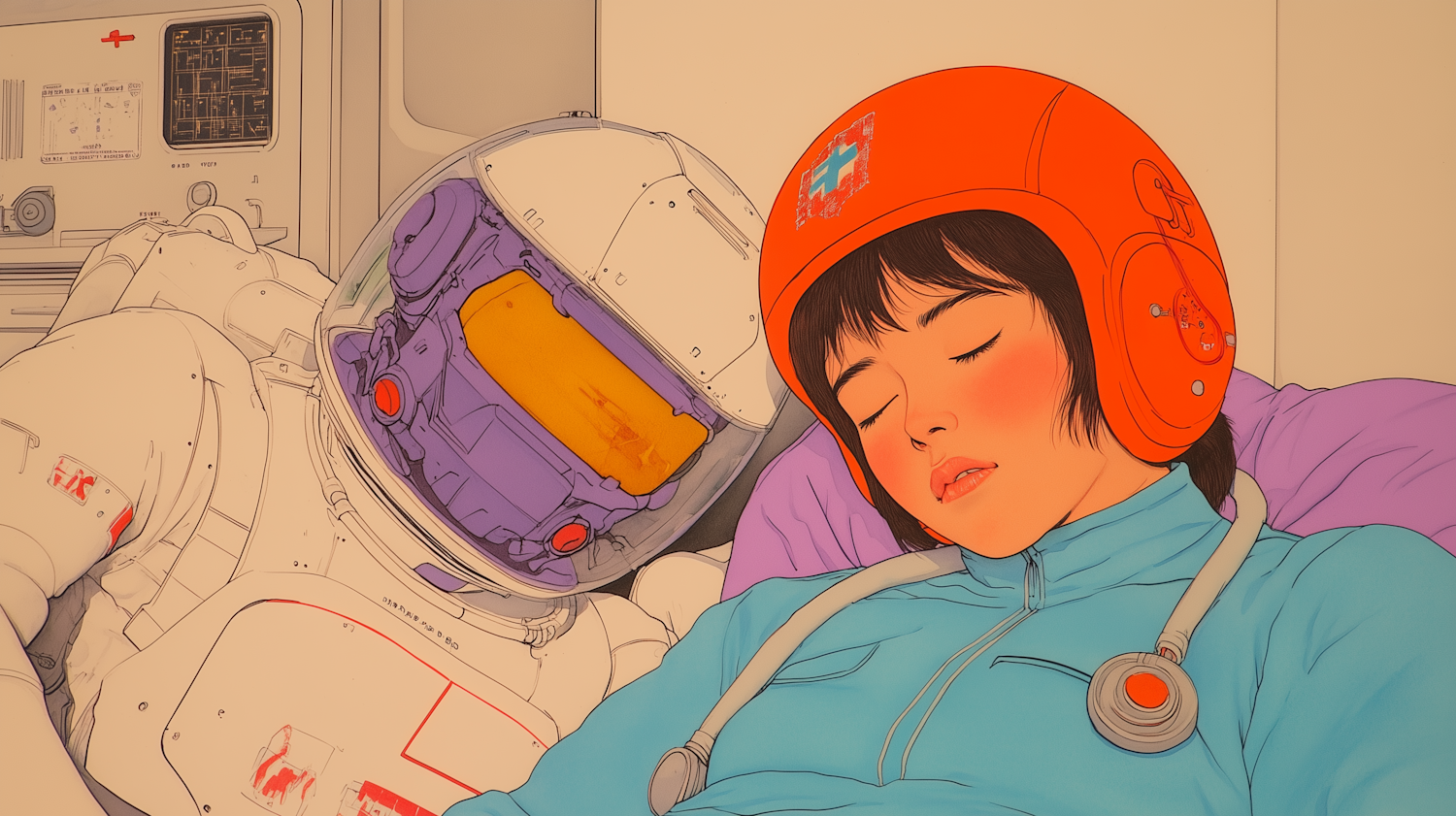 A serene scene of a young woman in an orange helmet sleeping next to an astronaut in a space suit, set in a futuristic environment.
