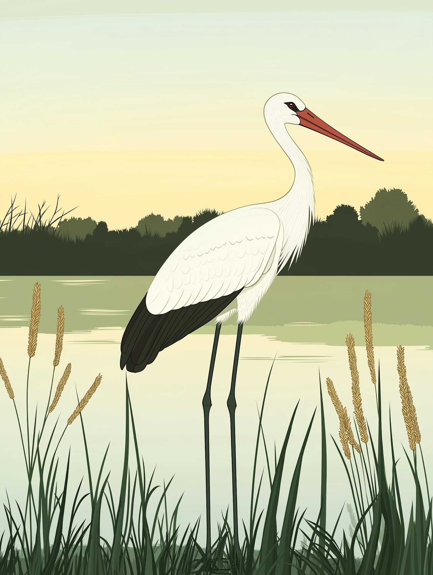 Elegant illustration of a white stork by a tranquil water body, surrounded by reeds and a soft gradient sky.