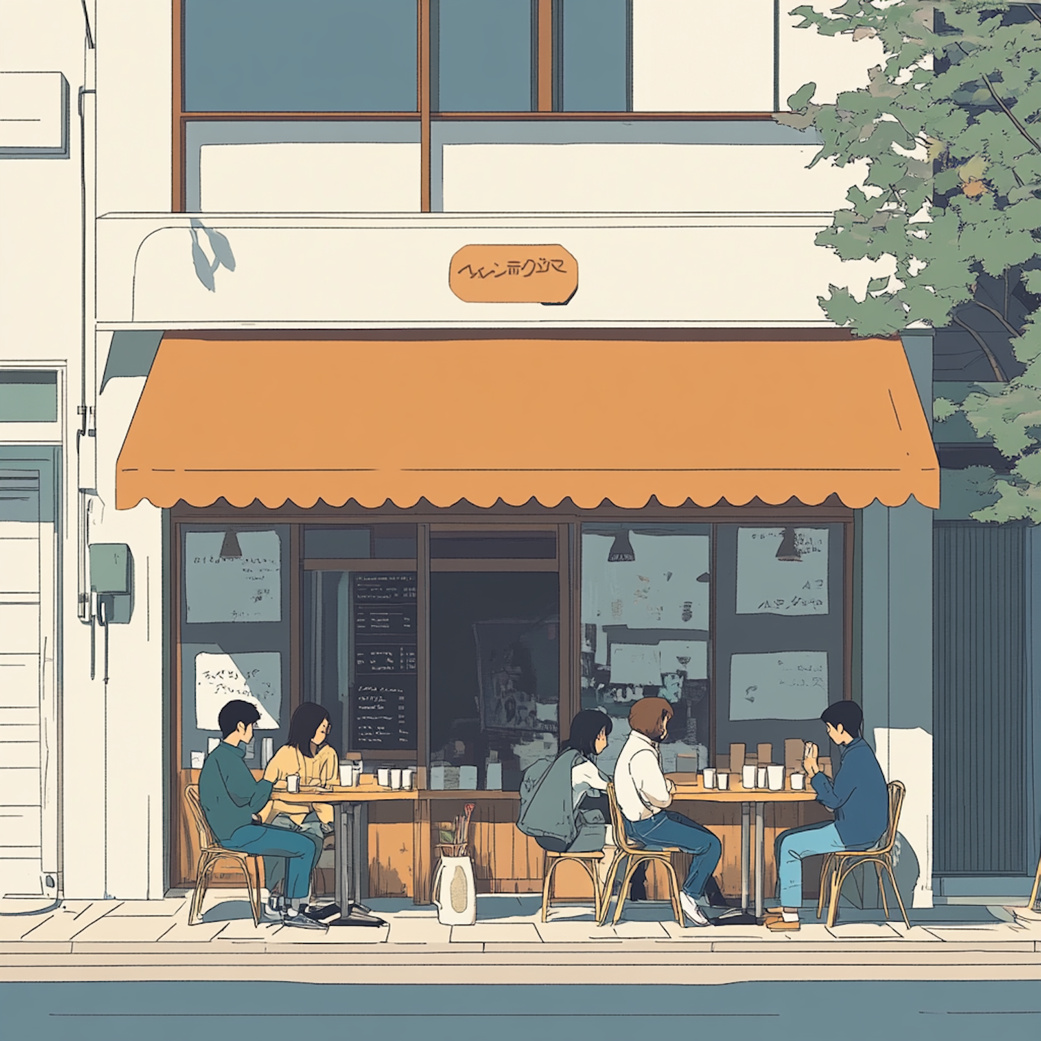Charming street café with orange awning, four people enjoying drinks outside, and a tree adding greenery to the urban scene.