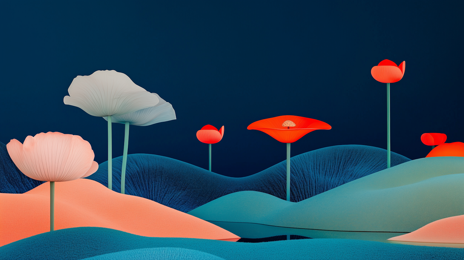 Surreal landscape with oversized flowers in vibrant colors against a deep blue background, creating a whimsical and serene scene.