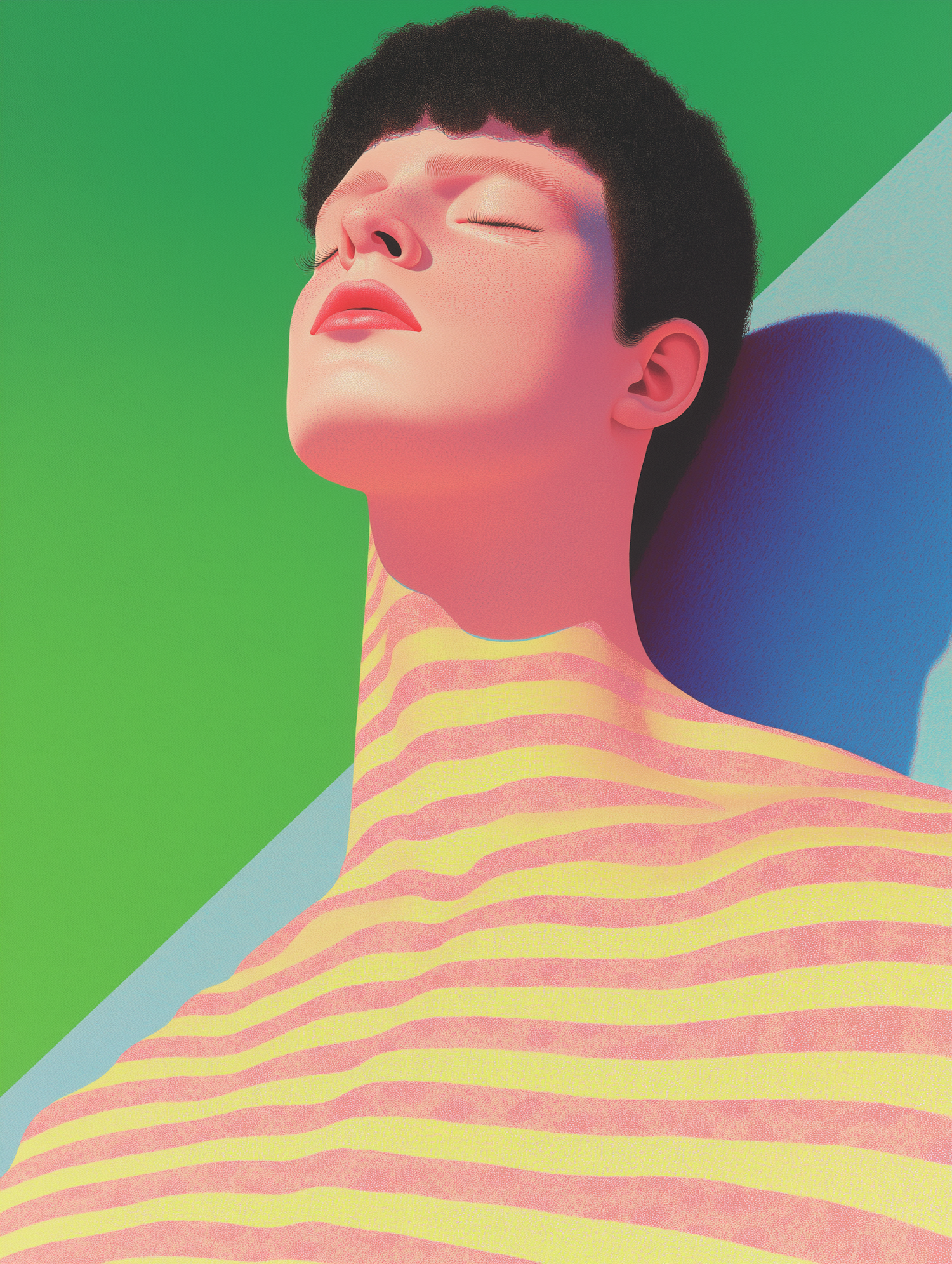 Stylized illustration of a serene person with pink skin and striped neck against a vibrant green and blue background.