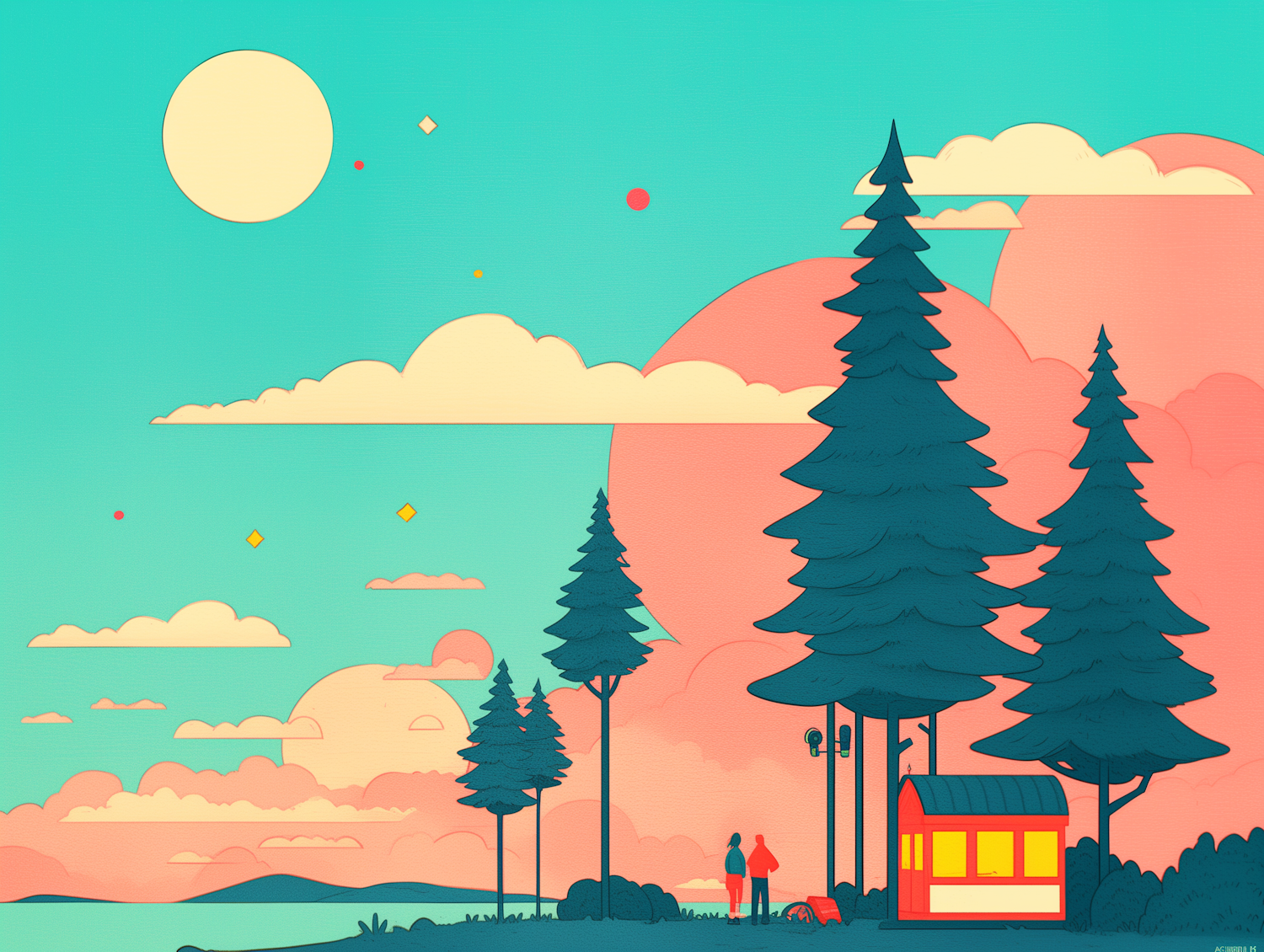 Vibrant illustration of a serene landscape with a sunlit sky, pine trees, and a cozy cabin. Perfect for nature lovers.