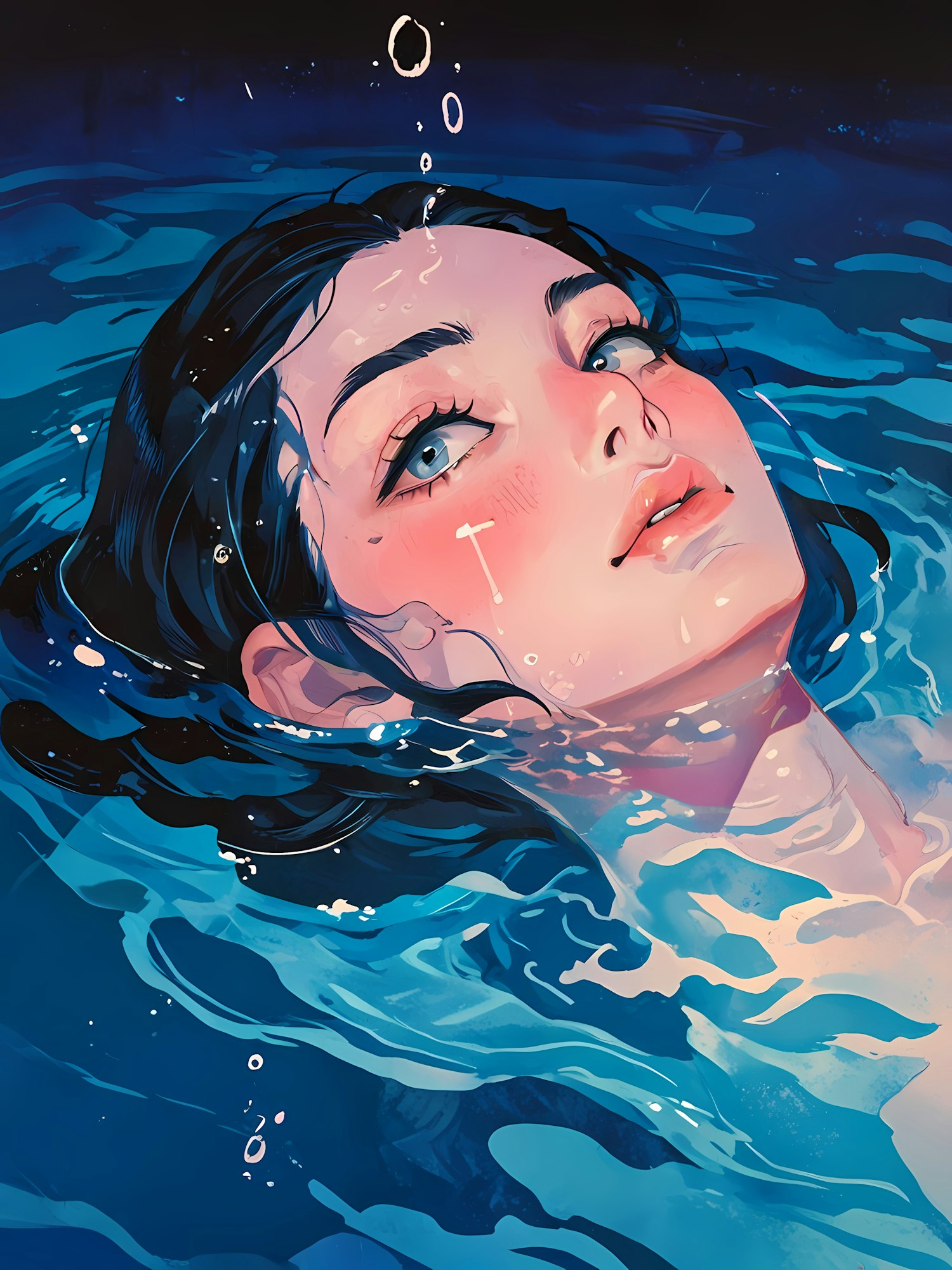 Illustration of a woman with blue eyes floating in water, surrounded by swirling shades of blue and turquoise.