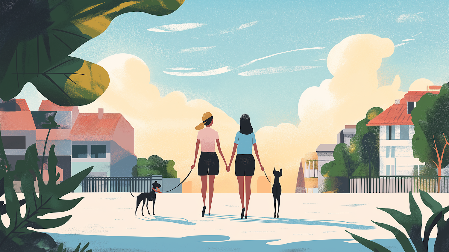 Two women walking dogs in a sunny suburban neighborhood, surrounded by modern houses and lush greenery, under a bright blue sky.