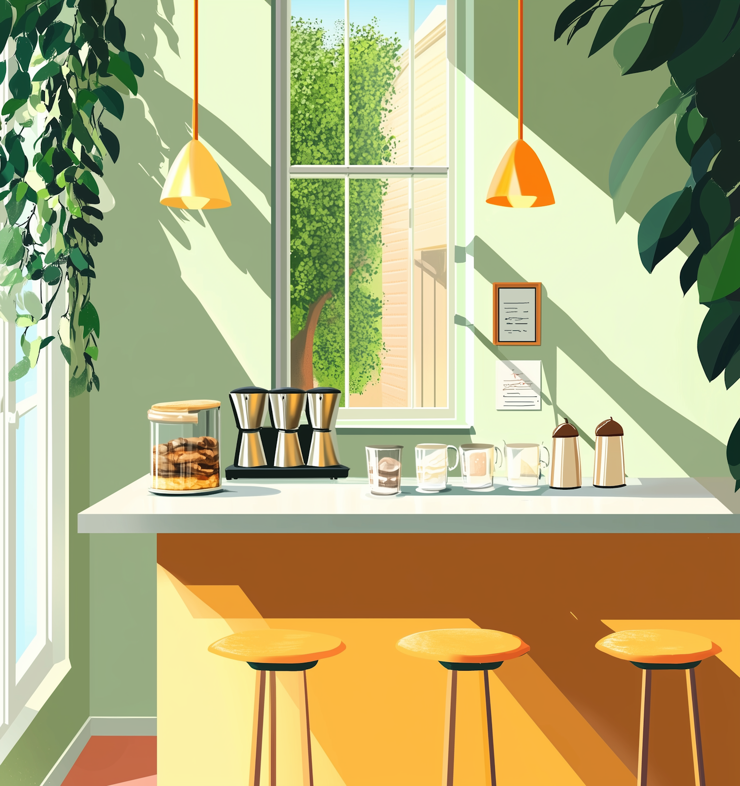 Sunlit kitchen with plants, cookies, and coffee setup. Warm yellow and green tones create a cozy, inviting atmosphere.