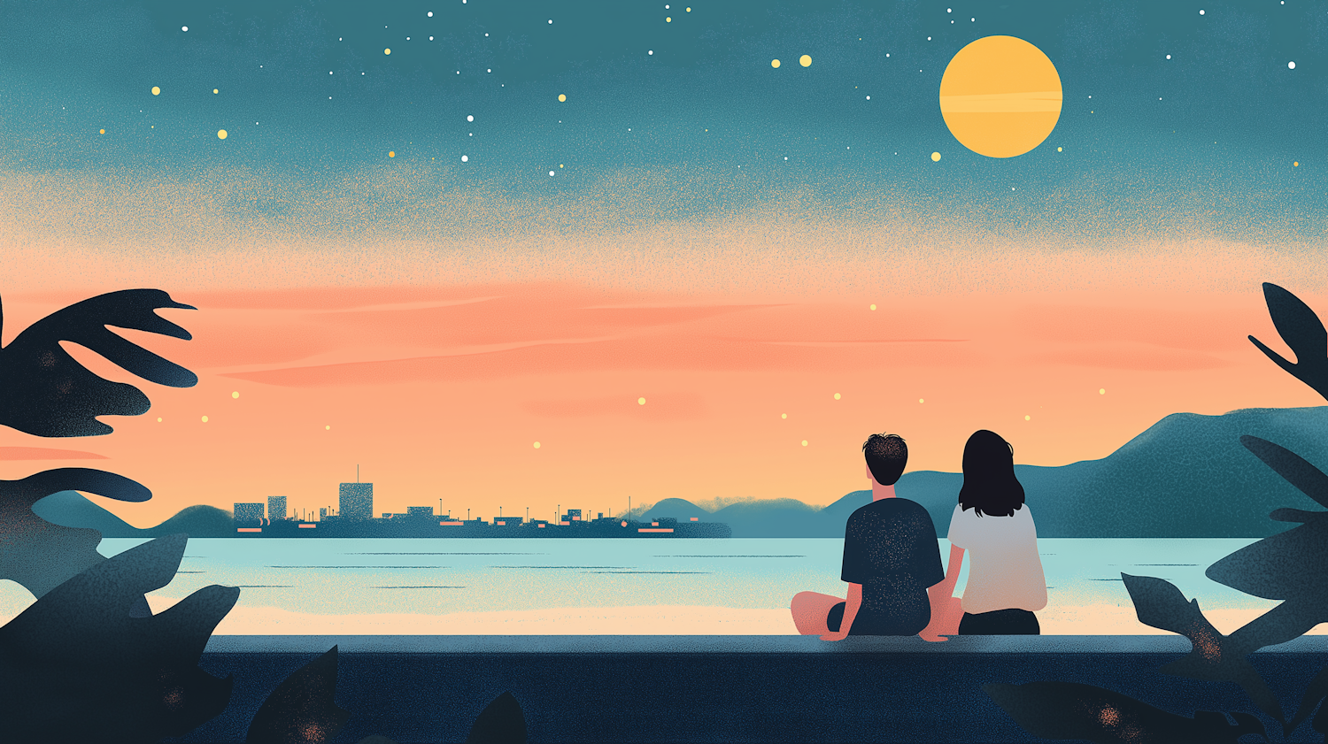 Couple sitting by the water, watching a sunset with a city skyline in the distance. Vibrant colors and serene atmosphere.